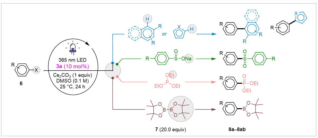 Using 3a, we performed photoreduction of organic halides under 365 nm LED in DMSO with Cs₂CO₃ and 10 mol% catalyst at room temperature, yielding product 8a in 62% (Scheme 5).
