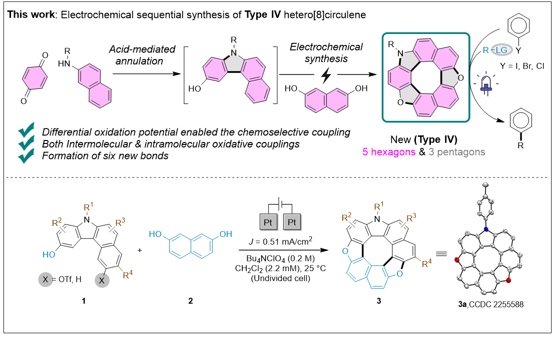 Our group developed a sustainable one-pot electrochemical synthesis of dioxaza[8]circulenes with high yields and good functional tolerance. Structural and photophysical studies showed their potential as efficient organophotocatalysts for diverse C–X bond formations under mild reaction conditions.