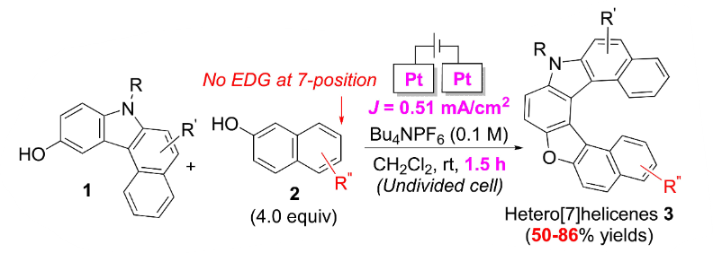 Building on previous success, in 2023 we expanded our electrochemical method to synthesize oxaza[7]helicenes—twisted molecules known for their unique optical and electronic properties. Using 3-hydroxybenzo[c]carbazole (1) and 2-naphthol (2) as examples, we took advantage of their different oxidation potentials to enable selective coupling and helicene formation. Without adding an electron-donating group at the 7-position of substrate 2, we stabilized intermediates and promoted the formation of oxa[7]helicenes, producing about 30 examples with yields up to 86%³.