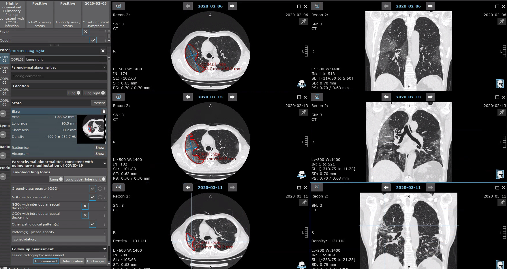 Based on the evidence available back in April 2020, the first version of a COVID-19 Mint EDC was drafted. It is based on the mint LesionTM medical software platform (Mint Medical GmbH, Heidelberg, Germany). Thereby, we enabled structured data annotation directly on primary imaging data from chest computed tomography. In addition, patient history and clinical data are reported in a standardized way in the evidence-based, context-assisted template. As an established software in radiological reporting, mint LesionTM and thus the developed COVID-19 EDC are able to depict disease courses and assess the progression of disease. In order to facilitate rapid, joint data acquisition early in the pandemic, we launched a cloud-based web platform for data to be uploaded, assessed, aggregated and analyzed.