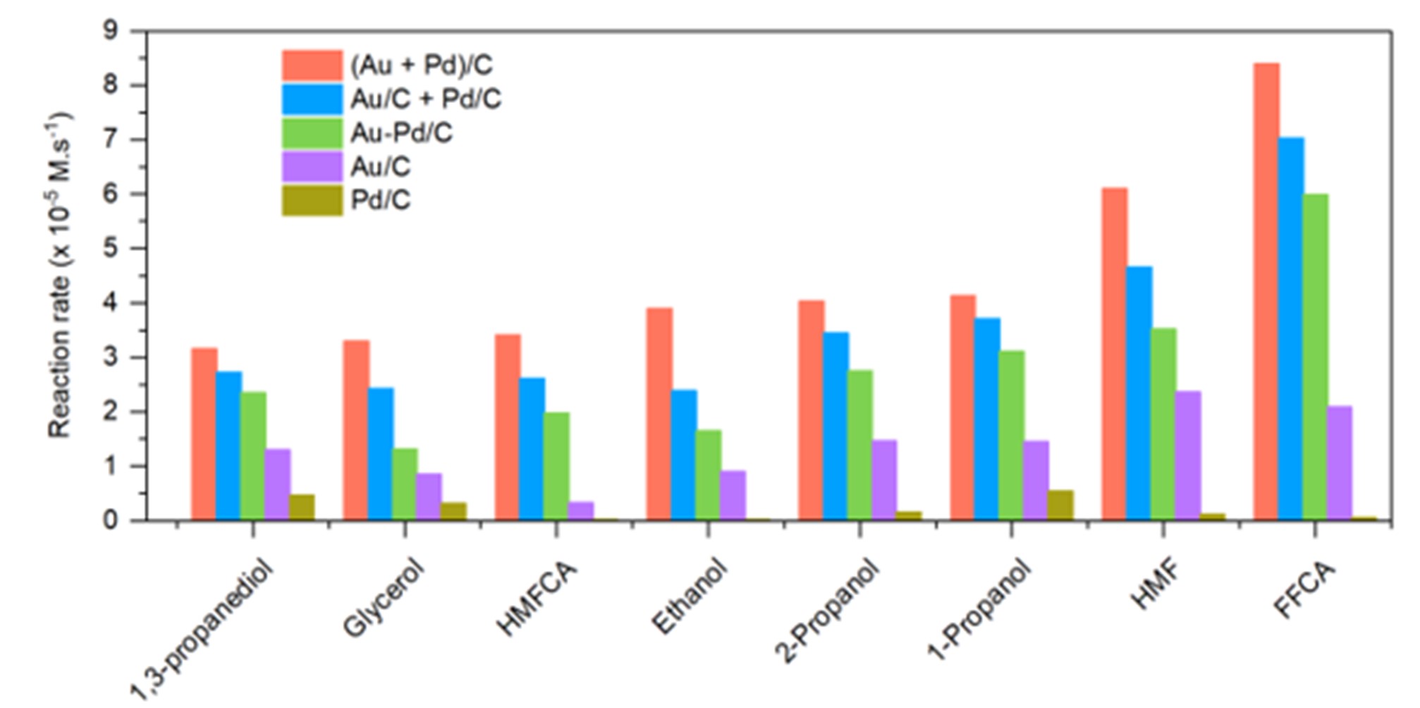 In our work, where we focus primarily on the ODH of 5-hydroxymethylfurfural (HMF) to furandicarboxylic acid, we demonstrate that through elemental separation of Au and Pd nanoparticles, catalytic activity can be significantly improved. This was evidenced by comparing the activities of physical mixtures of Au/C and Pd/C (Au/C+Pd/C) and catalysts that possess spatially separated monometallic particles of Au and Pd on the same support (Au+Pd/C), with conventional bimetallic alloys (Au-Pd/C). Subsequent experiments confirmed that this effect was not limited to the ODH of HMF, demonstrating the generality of the effect (Figure 1).