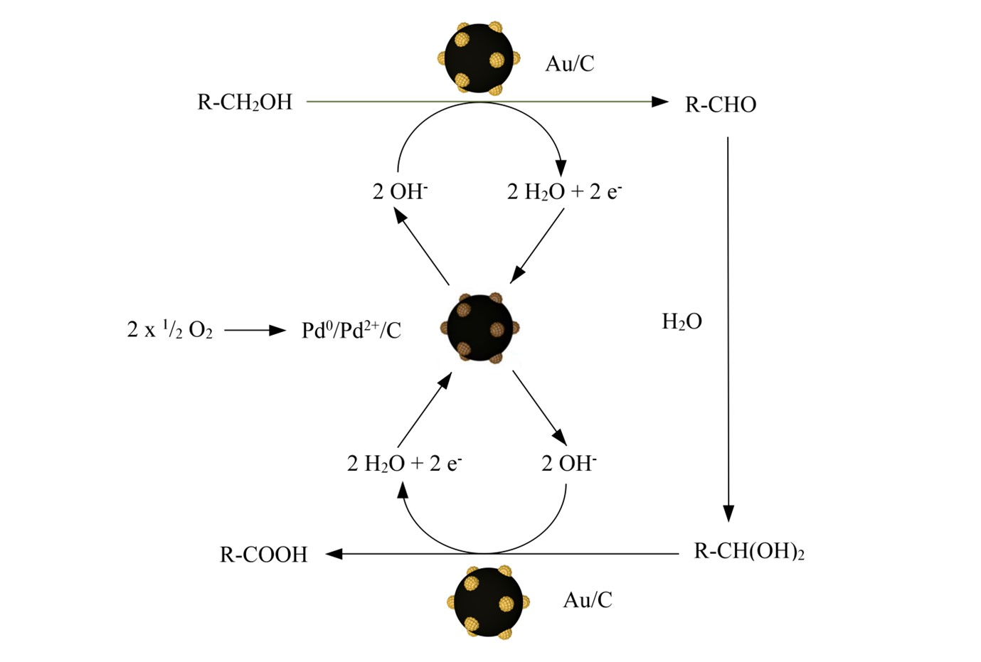 Figure 1. The spatial separation of Au and Pd in supported bimetallic heterogeneous catalysts enhances catalytic activity in several formyl and alcohol oxidation reactions.