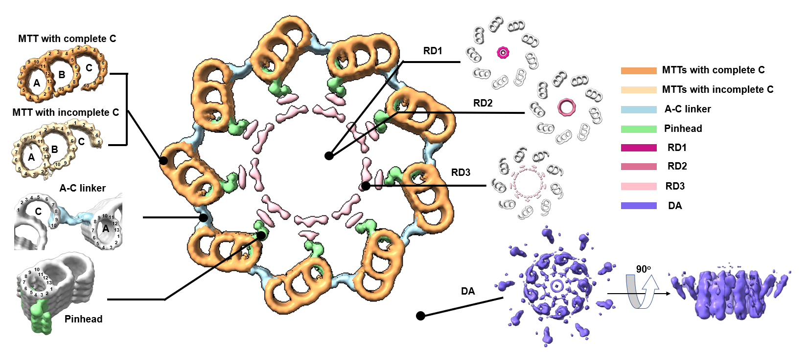 Figure 2.In situ structure of the human centriole. Cross-sectional view of human centriole slices in different local regions, which are reconstructed by STA. MTTs with a complete C-tubule and an incomplete C-tubule are coloured sandy brown and Navajo white, respectively. The A-C linker, pinhead, RD1, RD2, RD3 and DA are coloured light blue, light green, medium violet red, pale violet red, pink and medium slate blue respectively.