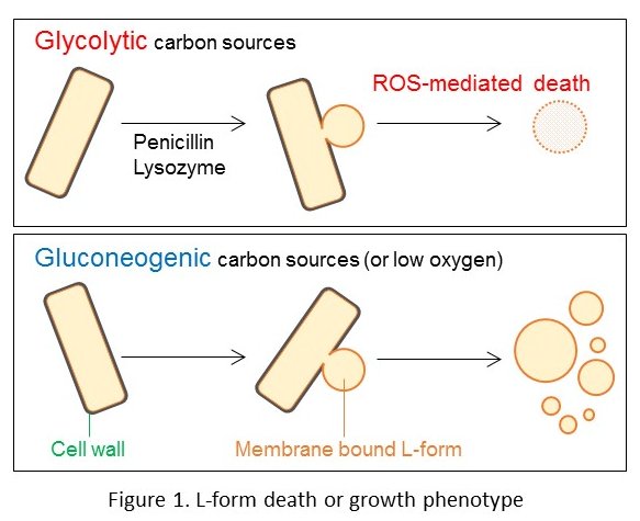 We now have a much better understanding of what are needed to enable bacteria to grow without the need for a cell wall or FtsZ under laboratory conditions (Figure 1). L-forms can escape from the surrounding cell wall by lysozyme treatment in osmoprotective media (Kawai et al., Cell 2018). Inhibition of cell wall synthesis promotes excess membrane generation, which drives the proliferation of L-forms (Mercier et al., Cell 2013). Avoidance of ROS toxicity by compensating for the metabolic imbalance in L-forms leads to their robust growth. Those requirements also work to promote L-form generation in many Gram-positive bacteria, including important pathogens.