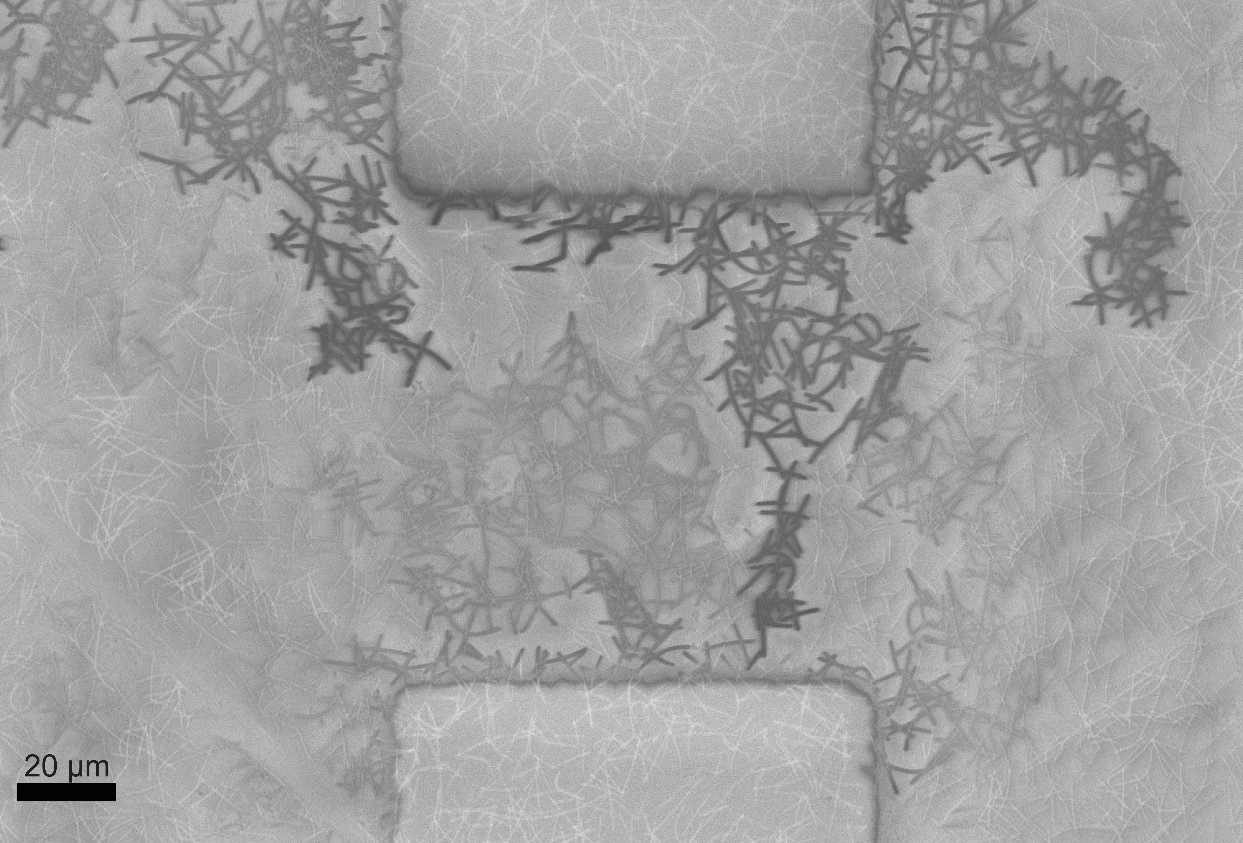 To understand pathway formation, we investigated another highly interconnected and disordered system, where the memory element is also controlled by the strength of the junction connection, a nanowire network. Nanowires are like normal electrical wires but extremely small, less than 100 nanometres in diameter, this is a hundred thousand times smaller than a millimetre, a thousand times thinner than a human hair, and 40-100 times thinner than a neuron. Just like normal wires, nanowires can be made from a variety of different materials and typically have surface coatings either from their growth process or an engineered coating to stop them clumping together in solution. Where one nanowire is in contact with another nanowire a junction is formed, and the behaviour of the network is dominated by the response of the junctions. The junctions can be broken down by heat or chemical treatment, or strengthened by repeated electrical stimulus. Nanowire networks are highly transparent and flexible, allowing them to be integrated into the next generation of electronic devices. (The nanowires used in this study were synthesized by S. Biswas in Prof. Holmes’ Materials Chemistry and Analysis Group, University College Cork, and P. Flowers from B. J. Wiley’s Lab in Duke University).