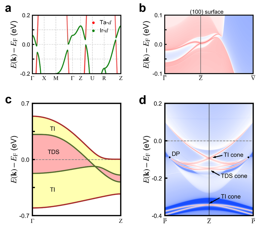 Fig. 2 a: DFT+SOC band structure of the (SrTaO3)1/(SrIrO3)1 superlattice. b: Band structure of (100) semi-infinite slab of the (SrTaO3)1/(SrIrO3)1 superlattice, calculated by the Green-function method. c: DFT+SOC band structure of (SrMoO3)1/(SrIrO3)1 superlattice along G to Z path. d: Band structure of (010) semi-infinite slab of the (SrMoO3)1/(SrIrO3)1 superlattice, calculated by using the Green-function method.