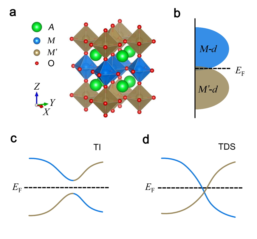 Fig. 1 a: The crystal structure of a (001) (AMO3)1/(AM’O3)1 superlattice. b: A schematic diagram of density of states of the superlattice. c and d: A schematic band structure close to the Fermi level where an M-d band and an M’-d band invert. c: Spin-orbit coupling opens a full gap between the highest valence band and the lowest conduction band, and non-trivial topological properties such as strong topological insulator (TI) may emerge. d: An M-d band and an M’-d band form a linear crossing around the Fermi level in the presence of spin-orbit coupling, which may lead to a topological Dirac semi-metal (TDS).