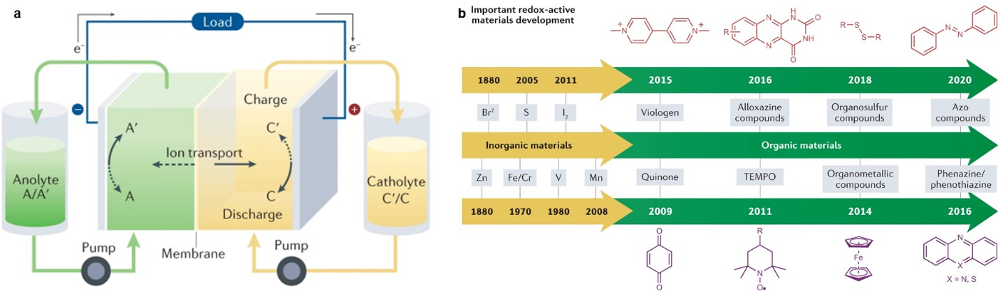 Fig. 1 Flow battery configuration and representative materials chemistries. a, A typical redox flow battery with redox-active materials dissolved in liquid electrolytes. b, Timeline of important inorganic and organic redox-active materials in the development of redox flow batteries.