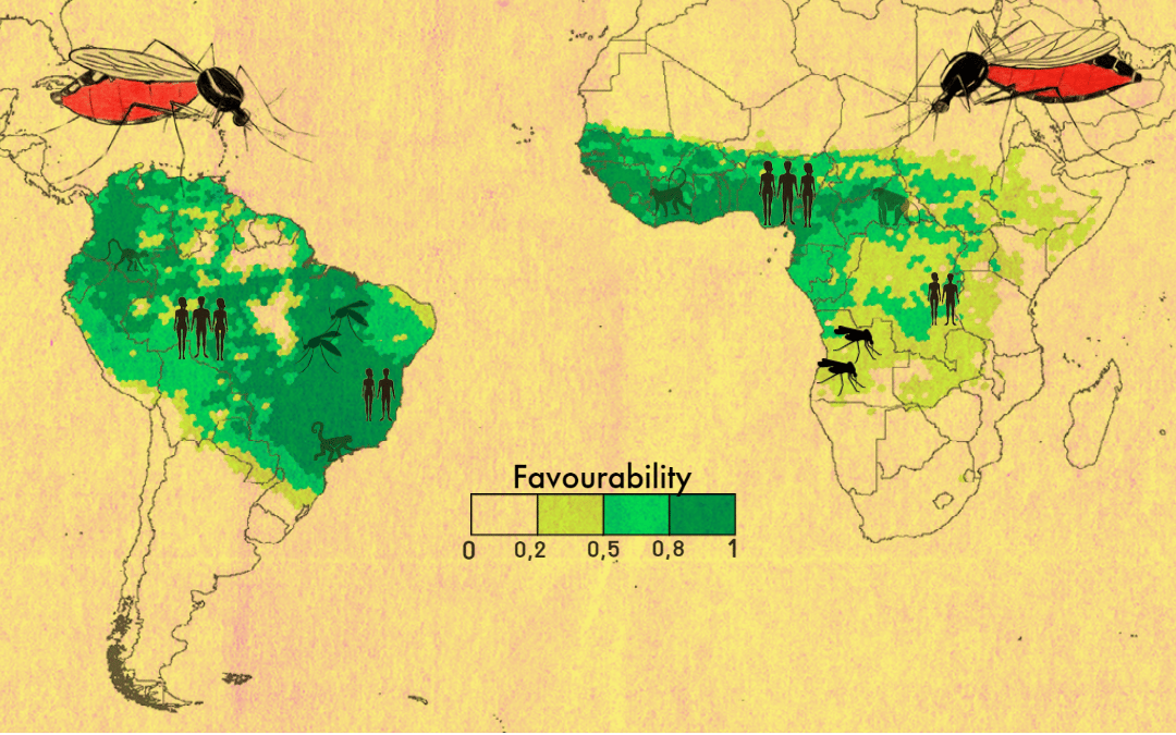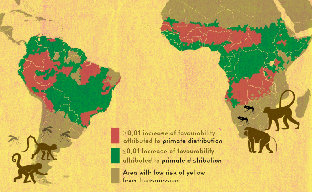 The yellow fever is a mosquito-borne disease caused by a flavivirus found in Africa and South America1. Since the late 20th century, there has been a resurgence of yellow fever in Africa and in South America2. The globalization of transports, and the expansion of vectors that are themselves evolving, help new virus lineages spread and increase the risk of transmission to humans3,4. Areas at risk of yellow fever transmission should be delineated according to geographic and environmental factors related to yellow fever, in order to prevent and respond efficiently to the occurrence of new outbreaks2,5. Previous studies have analysed the influence of non-human primates on the yellow fever infection rates in humans. Further studies were needed in order to understand the potential extent and geography of the risk of yellow fever transmission to humans favoured by the presence of non-human primates and sylvatic mosquitoes. This is the most relevant contribution of our results.
