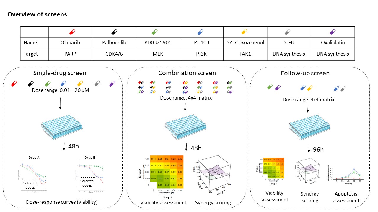 The workflow throughout the three screens (see Figure) should be regarded as highly adaptive; we ultimately let the results from one screen guide the fine details of the screen standing next in line. We started out with performing a single-drug screen, treating all cell lines with drugs in single application using a broad eight-points dose range. The overall aim of this screen was to identify drug-specific dose ranges, which would allow additional effects (synergistic as well as antagonistic) to be observed in the subsequent combination screen. Using CellTiter-Glo, a standard assay for assessment of viability response, we were able to identify a MEK inhibitor and a TAK1 inhibitor as the most strongly viability-compromising single-drugs across all cultivation conditions, indicating that pathways involving these targets are highly active in promoting survival and proliferation across tested cell lines.