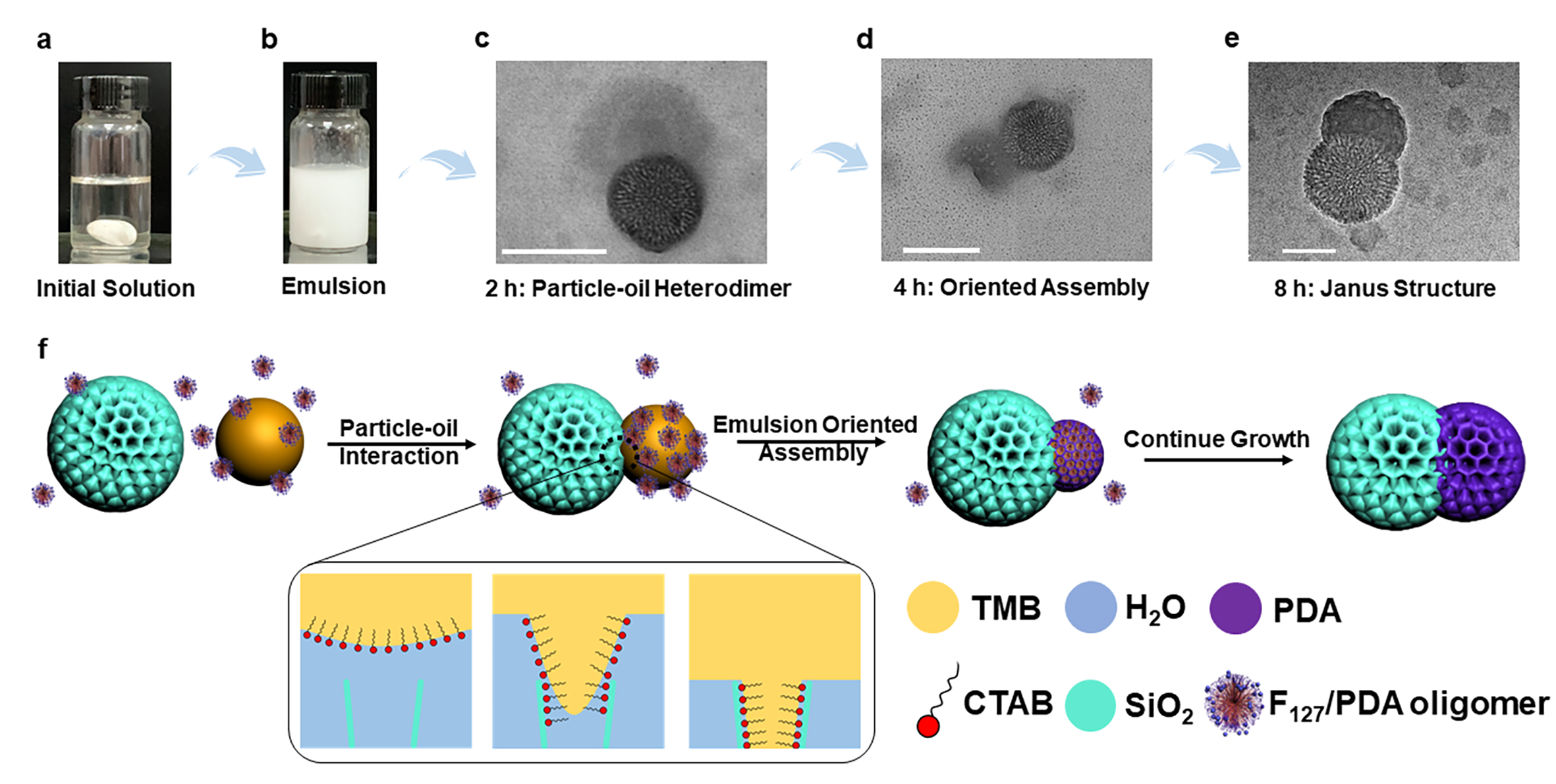 Figure 1. Mechanism of the emulsion-orientated assembly process. Digital photos of the reaction solution a) before and b) after the addition of TMB. TEM images of the products obtained by directly dropping the reaction mixture on the copper mesh at c) 2 h, d) 4 h and e) 8 h. Schematic illustration of the emulsion-directed oriental assembly approach for the fabrication of the dual-mesoporous Janus MSN&mPDA double-spherical nanoparticles. Scale bar: 200 nm for c and d, 100 nm for e.