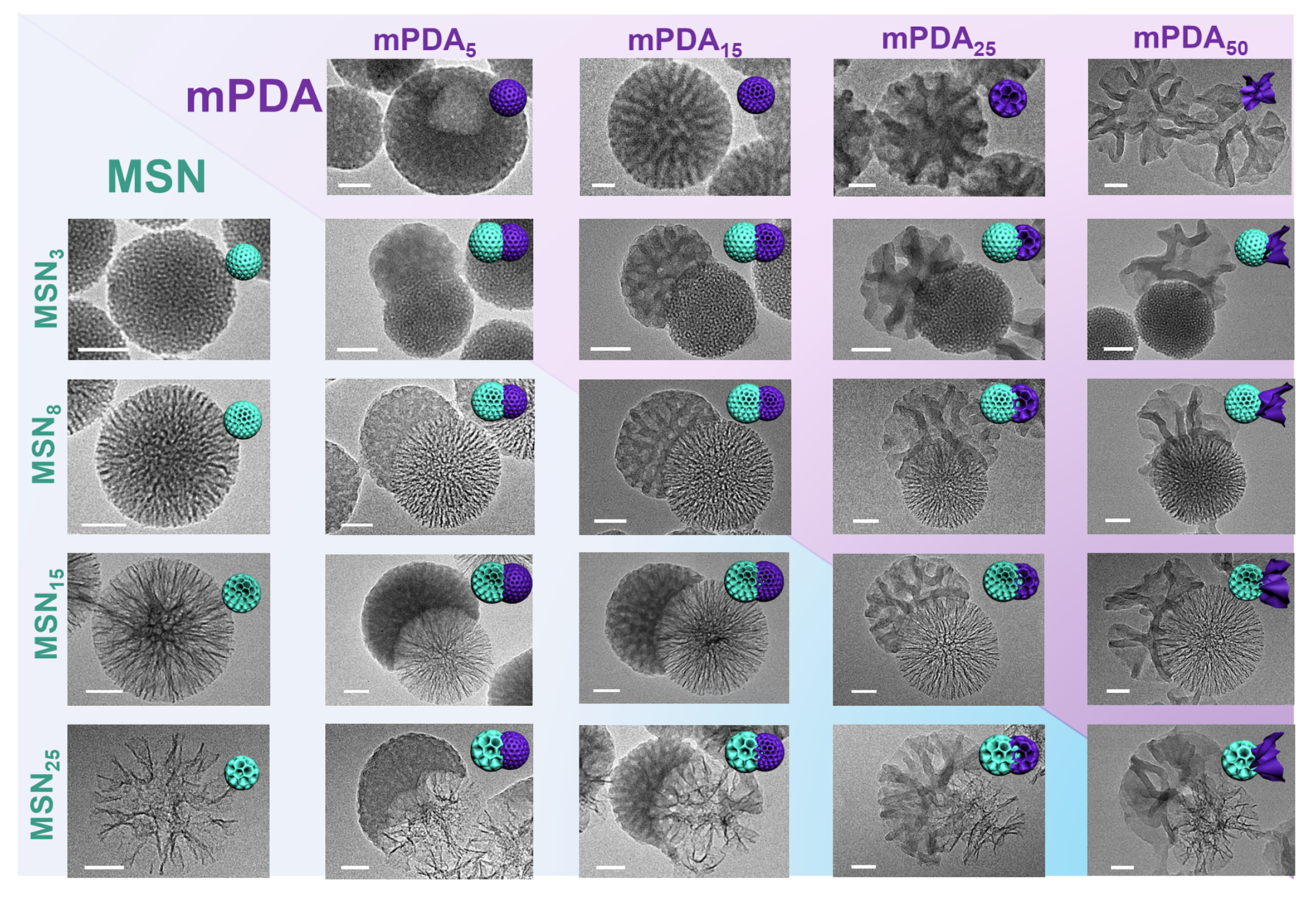 Figure 2. Janus double-spherical MSN&mPDA nanoparticles with tunable large mesopores. TEM images of the mesoporous silica nanoparticles with different pore sizes (denoted as MSNx, x = pore diameter in nm), the mesoporous polydopamine nanoparticles with different pore sizes (denoted as mPDAy, y = pore diameter in nm) and dual-mesoporous Janus MSNx&mPDAy nanoparticles with varied mesopore diameter on both sides of the Janus nanoparticles. Scale bar: 50 nm.
