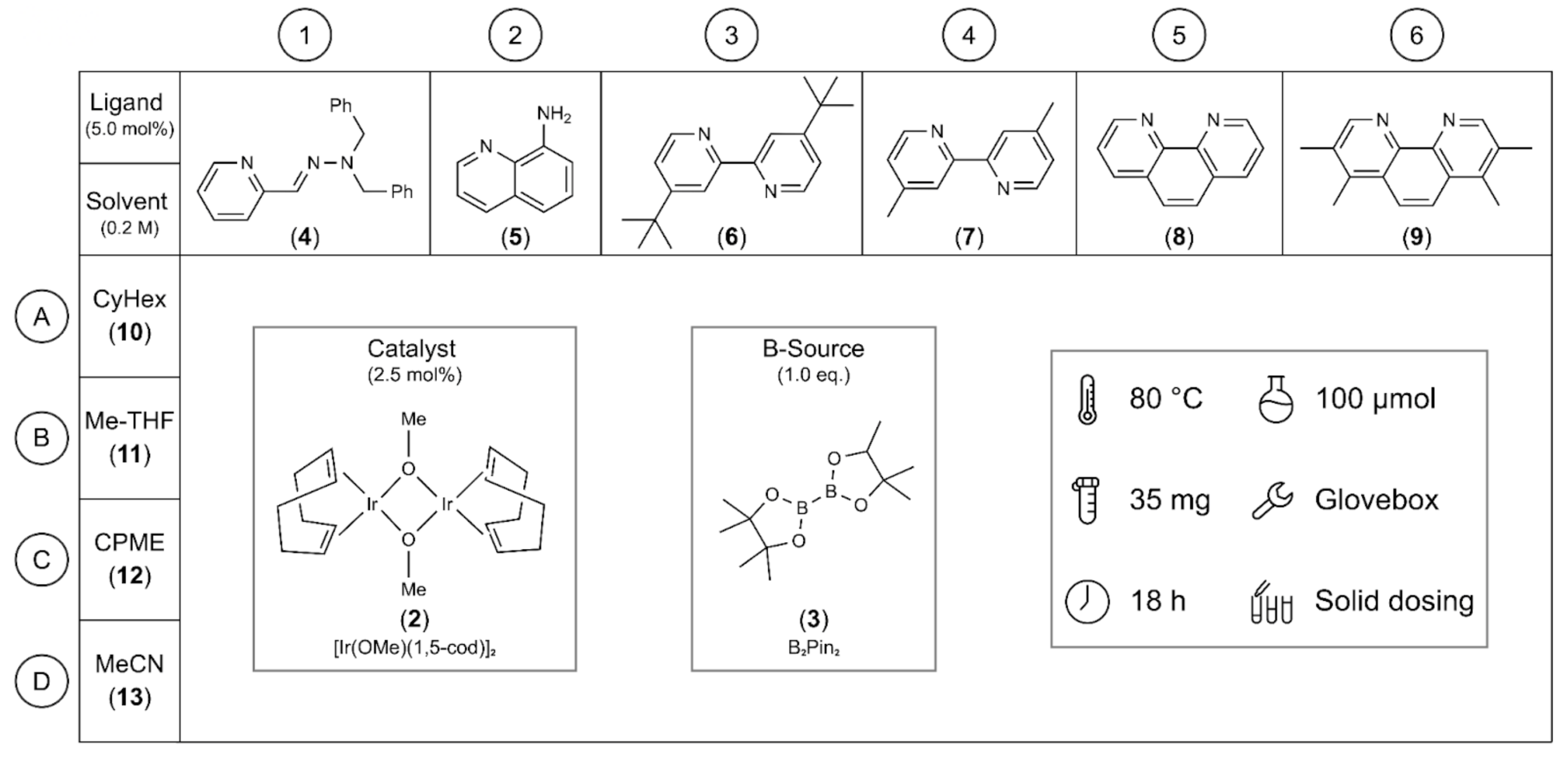 Fig. 2. Schematic of the 24-well borylation screening plates that were used in the experiments. We conducted screening tests involving one catalyst (2), one boron source (3), six different ligands (4-9), and four distinct solvents (10-13) for all the starting materials.