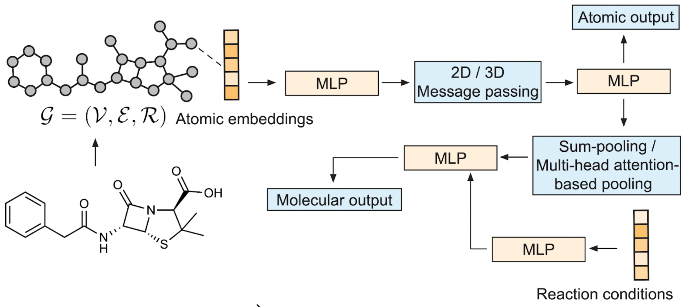 Fig. 3. Schematic of the graph neural network architecture. After passing the atomic features through the first MLP, the atomic features are updated via three message-passing layers. Subsequently, the learned atomic features are either transformed directly to the regioselectivity output, or pooled to obtain a whole-molecule feature space. This learned molecular feature space is then combined with the embedded features of the reaction conditions and transformed into the reaction output via a final MLP.