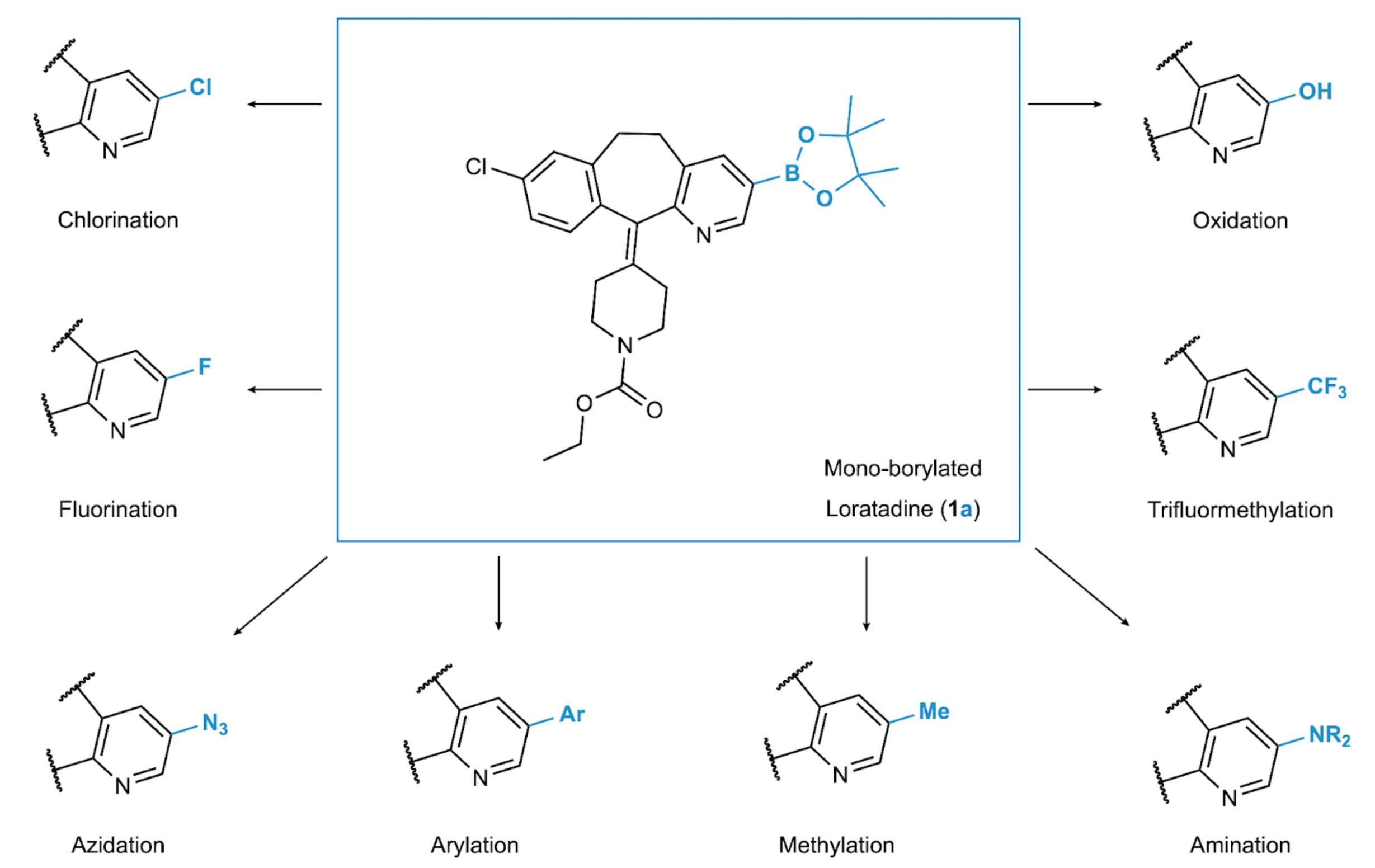Fig. 1. Late-stage borylation of a drug molecule. The example showcases mono-borylated Loratadine (1a), which can be obtained by borylating the drug Loratadine (1) and then further modified to incorporate various functional groups.