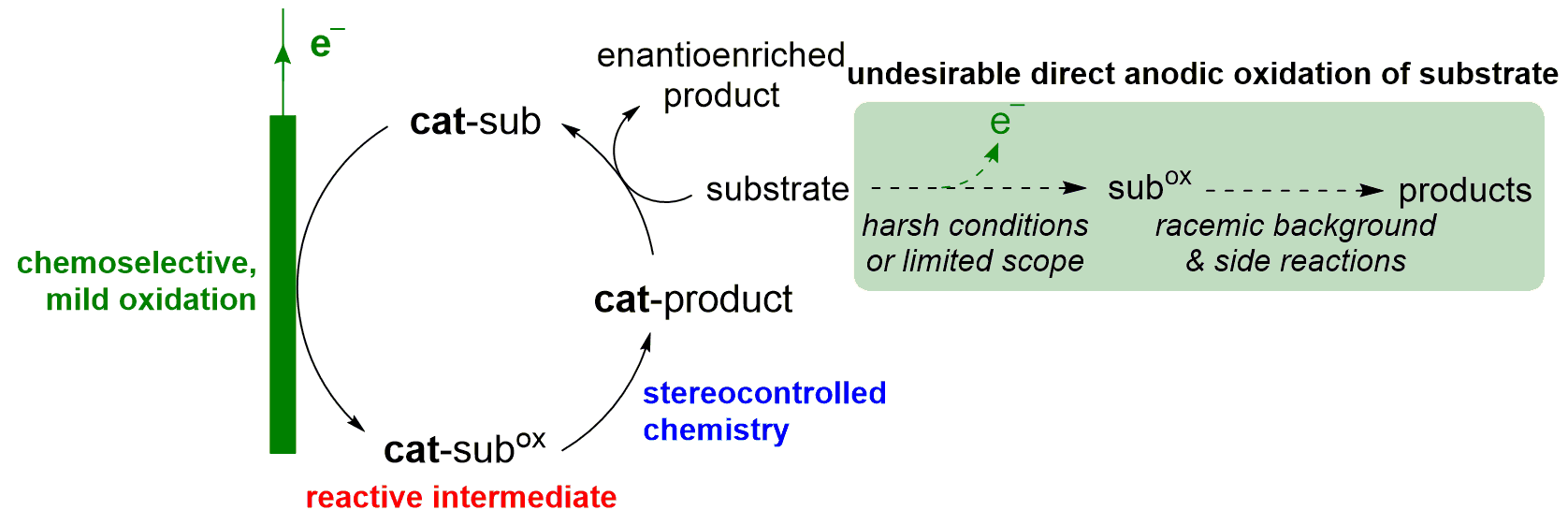 Organic electrosynthesis has recently attracted significant attention as a synthetic platform for redox reactions since the electrons come right out of a battery or electrical outlet instead of relying on stoichiometric amounts of waste-generating chemical oxidants and reductants. Along these lines, it is desirable to combine electrosynthesis with asymmetric catalysis because single enantiomer compounds are in ever increasing demand for the production of drugs, agricultural chemicals, flavors, fragrances, and materials. However, the challenge is to identify suitable catalysts which combine compatibility with the conditions within an electrochemical cell and at the same time provide selective chemical activation and high stereocontrol.