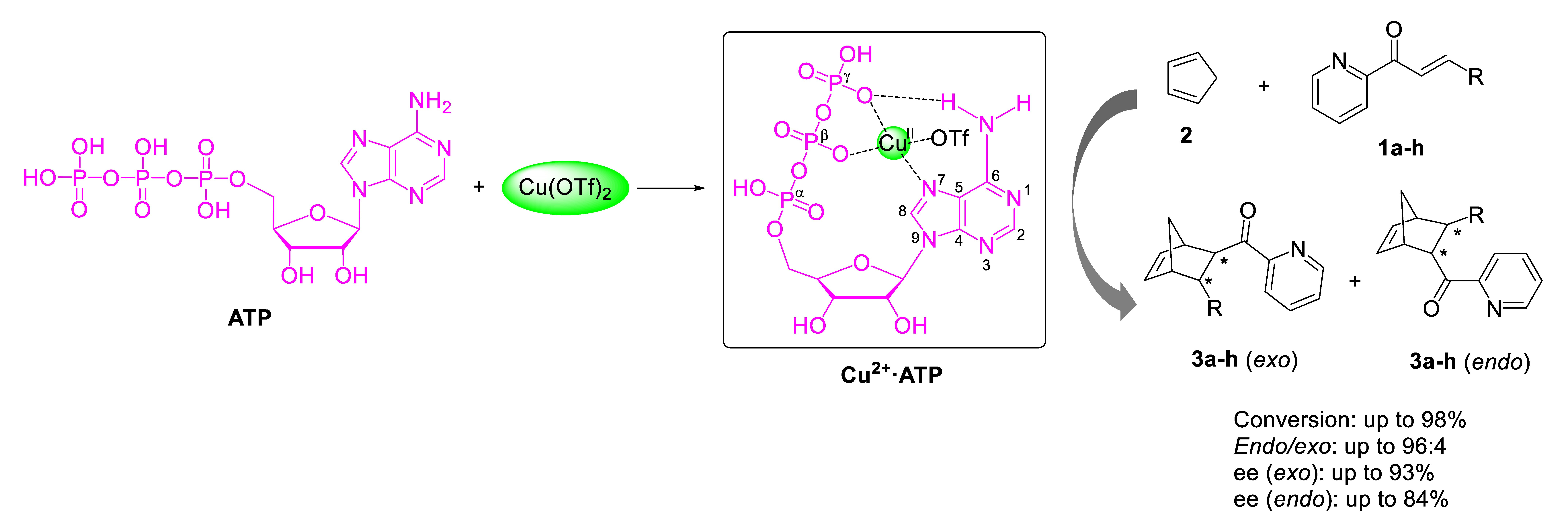 In this work5, we describe that a Cu(II)-ATP complex (Cu2+·ATP) efficiently catalyzes Diels-Alder reactions with high reactivity and enantioselectivity. Based on the ATP analogues experiments, spectroscopic characterizations and density functional theory calculations, three key residues (N7, β-phosphate and γ-phosphate) in ATP are identified in complexation of the Cu(II) ion, resulting in an entity of Cu2+·ATP that is responsible for the efficient catalytic activity and stereoselectivity (Fig. 1). In fact, this novel metallo-ATP catalyst is a derivative from the c-di-AMP based artificial metalloribozyme. The initial result is originating from a control experiment in c-di-AMP·Cu2+ catalyzed Diels-Alder reaction when investigating the effect of different fragments of c-di-AMP. Compared to c-di-AMP·Cu2+, adenosine, AMP, ADP and ATP are used as control scaffolds. In the Cu2+-catalyzed Diels-Alder reaction, the addition of adenosine or AMP produces no chiral product and ADP provides the product in low ee. Unexpectedly, the presence of ATP in a Cu2+-catalyzed Diels-Alder reaction gives a comparable enantioselectivity compared to c-di-AMP, which drives us to write another story of ATP-based enantioselective catalysis.