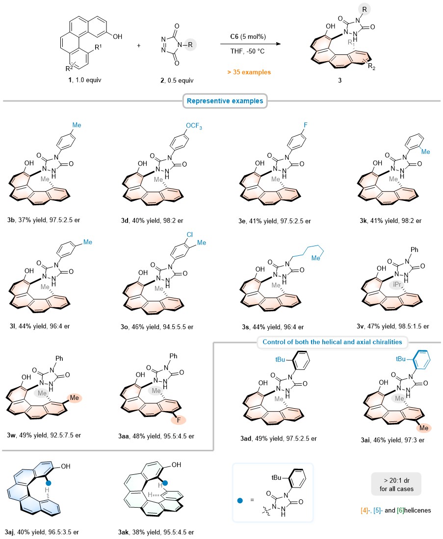 In conclusion, a terminal peri-functionalization strategy for the catalytic enantioselective preparation of helically chiral molecules was developed. The highly enantioselective synthesis of [4]carbohelicenes has been accomplished via an organocatalyzed intermolecular electrophilic aromatic amination reaction of 2-hydroxybenzo[c]phenanthrene derivates with diazodicarboxamides. The capacity of simultaneous control of helical and remote C-N axial chiralities made the current protocol especially intriguing, allowing for the construction of enantioenriched [4]-, [5]- and [6]helicenes featuring an urazole scaffold with both structural diversity and stereochemical complexity in good to excellent yields and enantioselectivities.