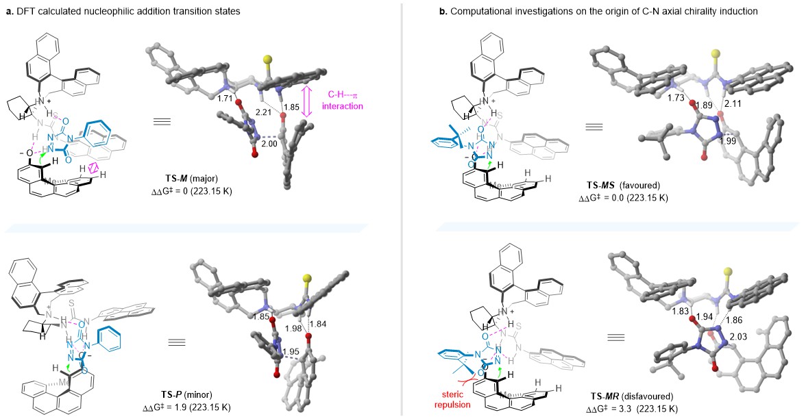 To gain insight into the reaction mechanism, density functional theory calculations were conducted and the computational outcomes matched with our experimental data very well (Fig. 5). The calculations revealed that catalyst brings the two reactants into close proximity via hydrogen bonding interactions and locks the relative orientation of the two substrates through hydrogen bonds and C-H---π interactions with the naphthalene skeleton and the pyrenyl substituent in the catalyst (Fig. 5a). With the favored activation model established, we next intended to unravel the origin of C-N axial chirality induction. It was found that the comparatively favored transition state TS-MS has lower free energy than the disfavored TS-MP, leading to the major (M,S)-configured product (Fig. 5b).