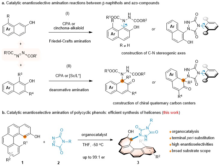 For this purpose, benzo[c]phenanthren-2-ol 1 with a substituent at its 12-position, in which the hydroxyl group could function as both a directing group and a binding site, was designed and synthesized (Fig. 2). We speculated that diverse functional groups could be incorporated at the 1-position in a catalytic helicoselective fashion by utilizing the nucleophilicity of the enol tautomer of substrate 1, thereby increasing the barrier to enantiomerization and giving access to enantioenriched 1,12-disubstituted [4]helicenes. Herein, highly reactive azo-compound 2 was employed to realize the functionalization of highly steric-hindered fjord-type area of polycyclic phenol 1. To the best of our knowledge, catalytic asymmetric amination reaction of phenols with azo-compounds represents one of flexible and versatile protocols for preparing functionalized molecules with different stereogenic elements. However, despite the conspicuous progresses of catalytic enantioselective amination reactions in constructing axially and centrally chiral compounds (Fig. 2a), the applications of similar chemical processes in helicenes synthesis have not yet been reported, even in a non-helicoselective version. To further extend the potential of Friedel-Crafts amination reactions in asymmetric synthesis and enrich the synthetic strategies of enantioenriched helicenes, we report herein an enantioselective terminal peri-amination strategy for the efficient synthesis of configurationally stable [4]- and [5]helicenes (Fig. 2b).