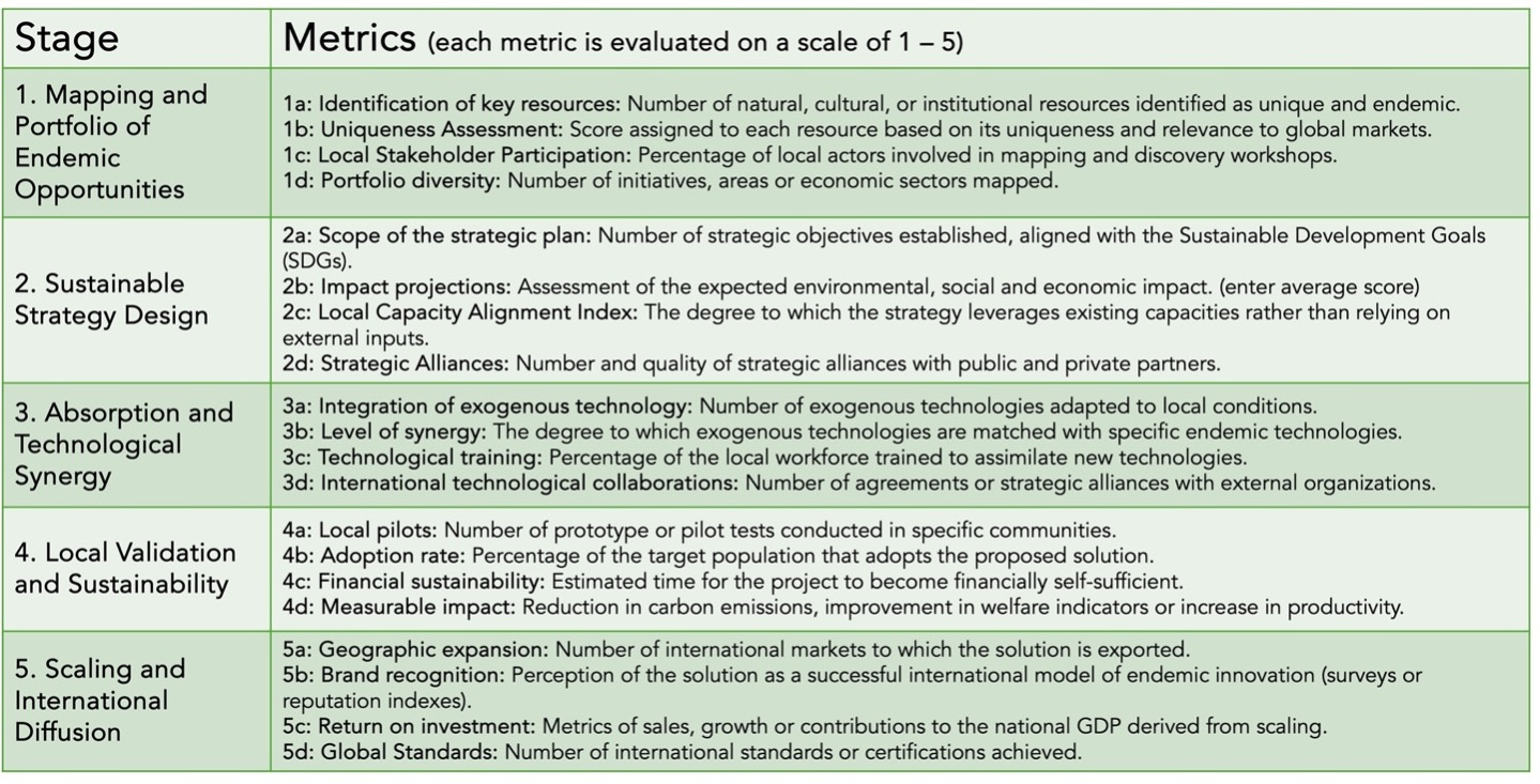 In the Endemic Innovation process presented, measuring results is essential to ensure that the initiatives developed are aligned with the strategic objectives of sustainability, technological integration, local impact and global scaling. The metrics associated with each stage allow not only to monitor progress, but also to identify areas for improvement and validate the effectiveness of the endemic approach in different regions and sectors. These metrics are designed to assess critical aspects of each of the stages and allow us to understand in greater detail whether a solution has a weak, medium or strong fit with the concept of endemic innovation.
