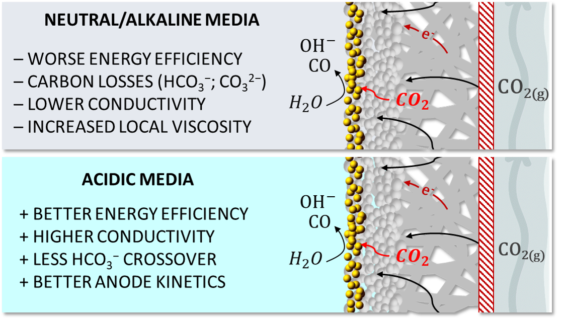 Figure 1. Advantages of carrying out CO2 electrolysis in acidic media, together with a schematic representation of the 3-phase boundary where CO2 reduction to CO takes place in gas diffusion electrode systems.