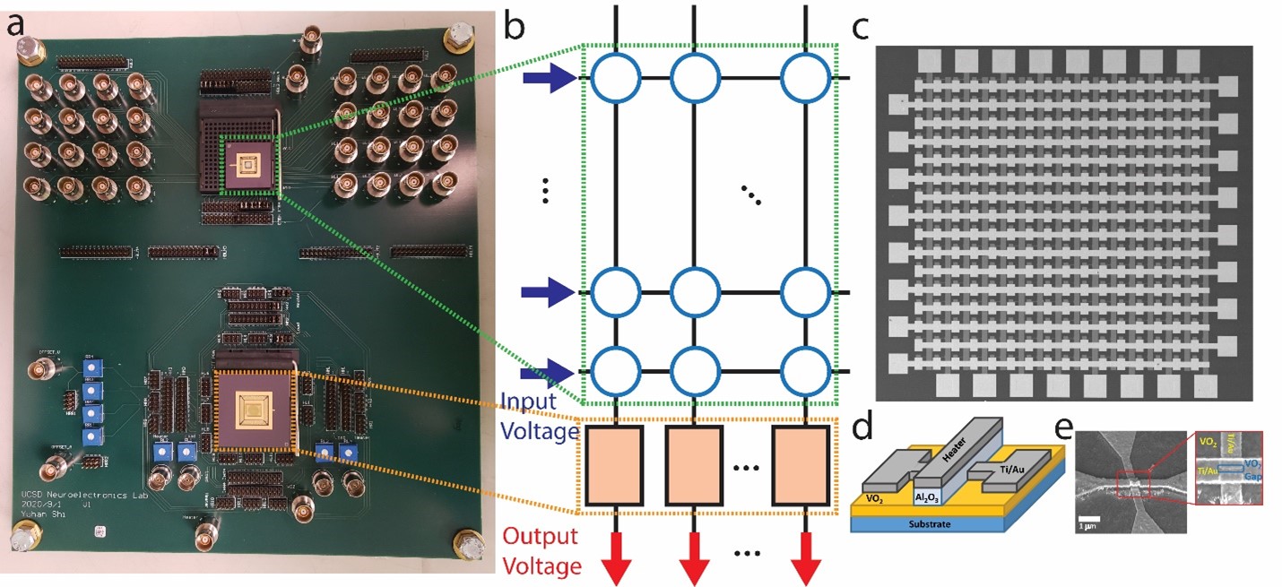 Neuroelectronics group (PI: Prof. Duygu Kuzum) and Schuller Nanoscience group (PI: Prof. Ivan K. Schuller) at University of California San Diego came up with the idea of harnessing electronic switching characteristics of Vanadium oxide (VO2) for implementing one of the widely used non-linear activation functions, ReLU, in a nanoscale device form. VO2 exhibits an interesting electrical switching phenomenon, insulator-to-metal transition so-called Mott transition. As the temperature of VO2 film increases above a critical temperature, the phase of some domains starts to switch from insulating monoclinic (M1) to metallic rutile (R) phase [6]. Then, the number of domains whose phase is metallic gradually increases as we further increase the temperature, leading to a gradual change in resistance instead of conventional abrupt switching. We fabricated a proof-of-concept device that has a nanowire heater on the top of a VO2 gap with an electrical insulator in-between. With this device structure, the temperature of the VO2 film can be controlled precisely by adjusting the current flow through the heater. As a result, the resistance of the VO2 gap can be gradually decreased as we increase the amount of current flow through the heater, which emulates the output characteristics of ReLU function. More importantly, this Mott ReLU device can generate output voltage enough to drive another synaptic array without additional drivers. It enables direct stacking of multiple network layers with minimal peripheral circuits, which is essential for large-scale neural network hardware implementations.