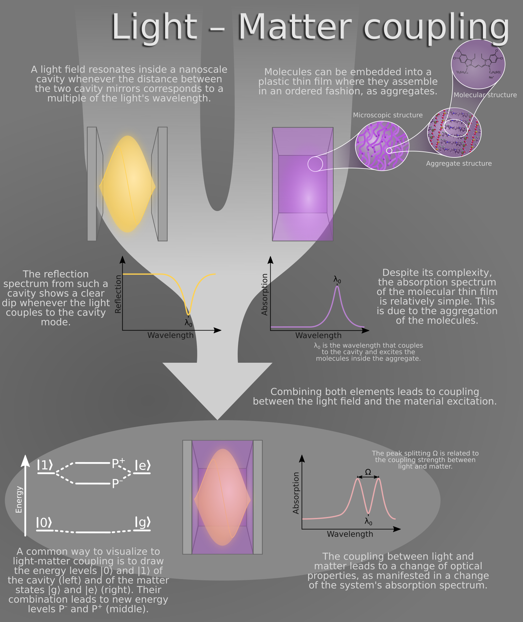 Microscopically, the polariton formation is a result of the energy alternating between the electromagnetic field confined within the resonator and the material embedded inside; quite similar to the back-and-forth transfer of energy between two coupled pendula, when only one is initially set in motion. This interaction between the two components of the light-matter system modifies its energetic “landscape” and leads to a change in optical properties and chemical reactivity. As the electromagnetic field can be controlled precisely via the resonator design (thickness, reflectivity, etc.) the properties of the system can be adjusted ad hoc, providing the means for the rational design of novel applications.