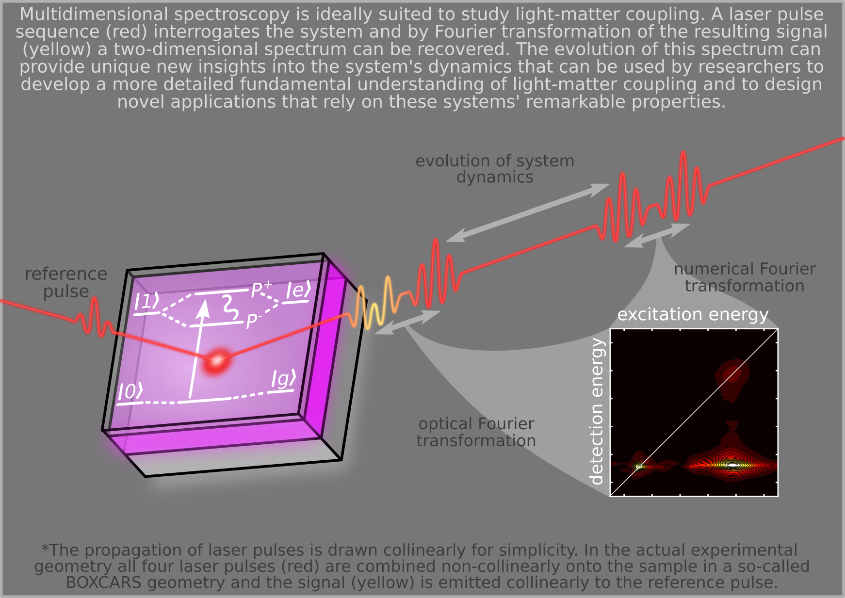 To achieve these results, the authors used state-of-the-art visible multidimensional spectroscopy (an optical domain analogue of nuclear magnetic resonance spectroscopy), which allows to overcome the typically encountered uncertainty between time and energy resolution in optical spectroscopy and is uniquely suited to study these light-matter interactions. These results are deemed to stimulate future experiments on similar systems and contribute to the development of novel applications, harnessing the combined advantages of light and matter.