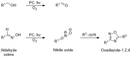 In the context of the article highlighted in this post, rational approach was also extremely useful. Dehydrogenation reactions, such as conversion of primary alcohols to aldehydes by metal oxides and carbon nitride semiconductors, have been thoroughly studied in heterogeneous photocatalysis. Using this well-investigated reaction as the initial point, I proposed that substitution of primary alcohol with aldehyde oxime, under otherwise identical photocatalytic conditions, could yield nitrile oxides instead of aldehydes. As nitrile oxides are highly reactive compounds, they can be conveniently trapped by nitriles giving oxadiazoles-1,2,4.