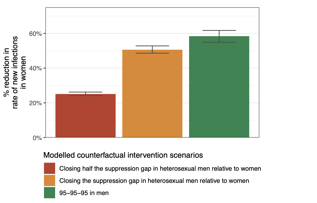 To estimate the likely impact of closing the viral suppression gap among men, we applied predictive statistical models grounded in the evolving transmission dynamics. Our projections indicate that closing the viral suppression gap in men could have effectively halved rates of new infections among women and eliminated gender disparities in acquiring HIV.
