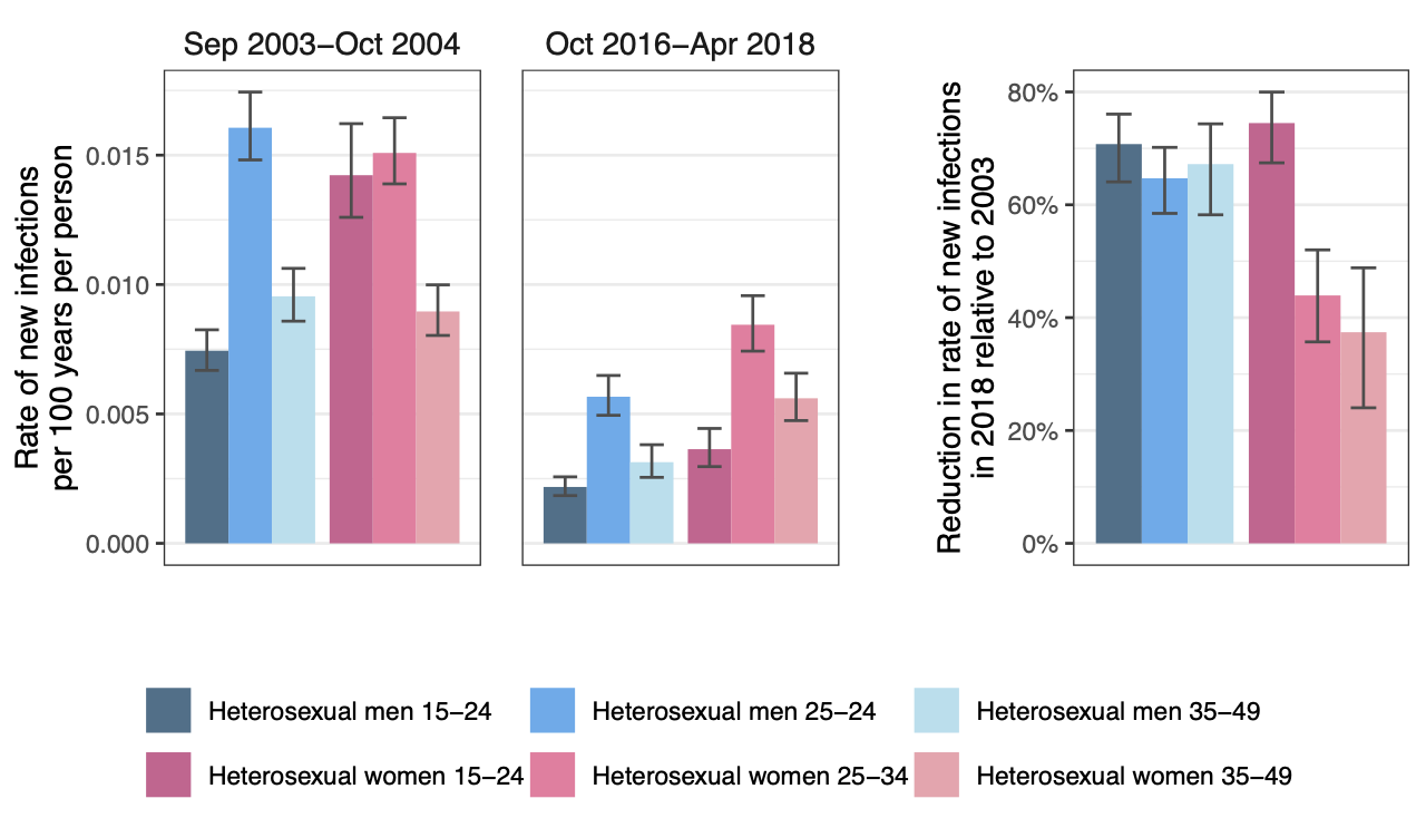 We also document a significant difference in the rate of decline of new infections between men and women, with new infections among boys and men declining much faster. Additionally, by examining heterosexual transmission networks reconstructed from pathogen genomes, we show an increasing contribution of male-to-female transmission to new infections. This contribution has risen steadily from 57% to 63% over the period from 2003 to 2018, despite the fact that a greater number of women are living with HIV than men. Additionally, our analysis of transmission networks highlights that heterosexual male partners involved in transmission are now considerably older than they were a decade earlier, with most new infections originating from men aged 30 to 39 years.