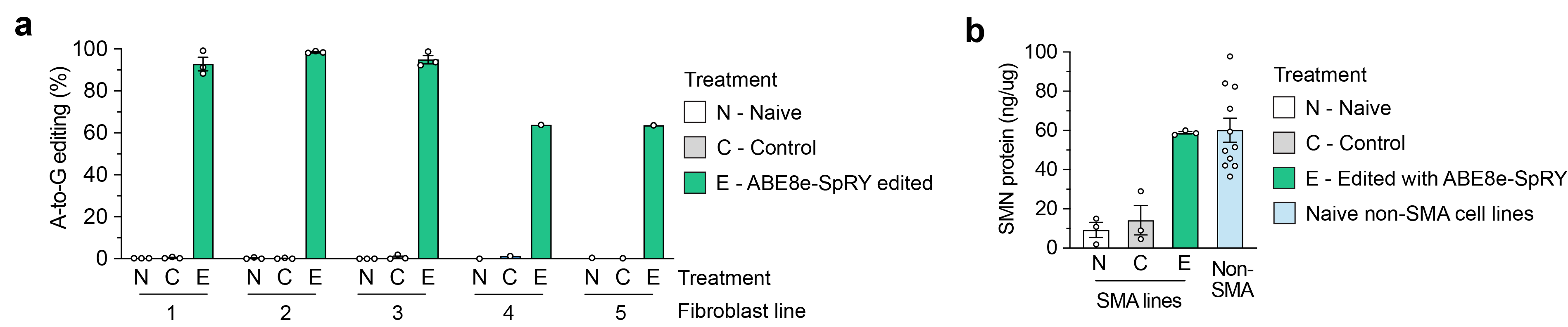 To develop a base editing approach to correct SMN2 C6T, we engineered and tested the efficiency of several CRISPR base editors capable of catalyzing A•T-to-G•C edits1-3. Importantly, the deaminase domain of these base editors can act in a narrow ~7-8 nucleotides ‘edit window’ within the target site at a fixed distance from the protospacer-adjacent motif (PAM; Figure 1b). Thus, the efficiency of base editing is dependent on the availability of Cas9 variant enzymes that can recognize PAMs at the appropriate distance upstream, towards maximizing editing efficiency of the intended base while minimizing unwanted editing of nearby bases that also fall within the edit window (bystander edits). In our study, we tested >100 combinations of guide RNAs (gRNAs) and adenosine base editors (ABEs) to understand the best combination to correct SMN2 C6T. One optimized combination that utilized a near-PAMless CRISPR-Cas enzyme, named SpRY4, resulted in up to 99% intended editing in SMA patient-derived fibroblasts (Figure 2a) with no bystander editing. In addition, we found that the DNA off-target profile of our optimized ABE-mediated C6T edit is highly specific in SMA-fibroblasts. As a result of this edit, we observed recued SMN protein levels to normal levels (Figure 2b). These results demonstrate that we could achieve high levels of SMN2 correction by optimizing and testing various ABE & gRNA combinations, leading to a durable edit that can restore SMN protein expression to near wild-type levels.