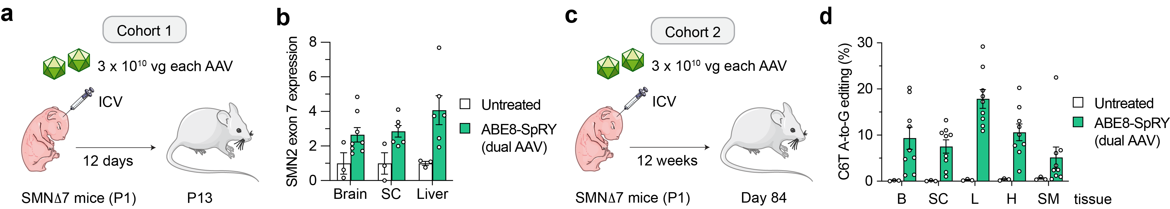 Next, given that SMA is a neuromuscular disease primarily affecting the CNS (motor neurons), but also other peripheral tissues, we explored whether our editing approach could be translated into an in vivo model of SMA. Delivery of our optimized ABE and gRNA via dual adeno-associated virus (AAV) vectors into an SMA mouse model (Figure 3a) resulted in precise SMN2 C6T editing in bulk tissue. Notably, the levels of SMN2 C6T correction were sufficient to promote a significant 2- to 4-fold increase in SMN transcript levels in various tissues from SMA mice (Figure 3b). These editing levels led to a modest phenotypic change, which is expected due to the severity of this mouse model with a short period of intervention. To determine whether longer follow-up could result in higher SMN2 C6T editing, we analyzed a cohort of non-SMA SMND7 mice at 12 weeks after a P1 ICV injection and observed up to 20% on-target editing in the brain and up to 30% editing in liver (Figure 3c-d). Thus, other approaches able to provide an extended therapeutic window in this severe SMA mouse model are likely necessary for a better phenotypic rescue before irreversible pathology. Another recent contemporary study performed an experiment involving co-administration of an antisense oligonucleotide treatment (i.e., nusinersen) combined with a similar in vivo ABE-mediated SMN2 C6T editing strategy5. Nusinersen extended the therapeutic window of SMA mice sufficiently to permit superior phenotypic improvements from C6T editing in this severe SMA mouse model. Importantly, we observed comparable levels of on-target editing when comparing our C6T base editing approach to the base editor from this independent study5, suggesting that different customized base editors can be applied to provide durable benefits for SMA patients via strategies that are agnostic of their SMN1 mutation.
