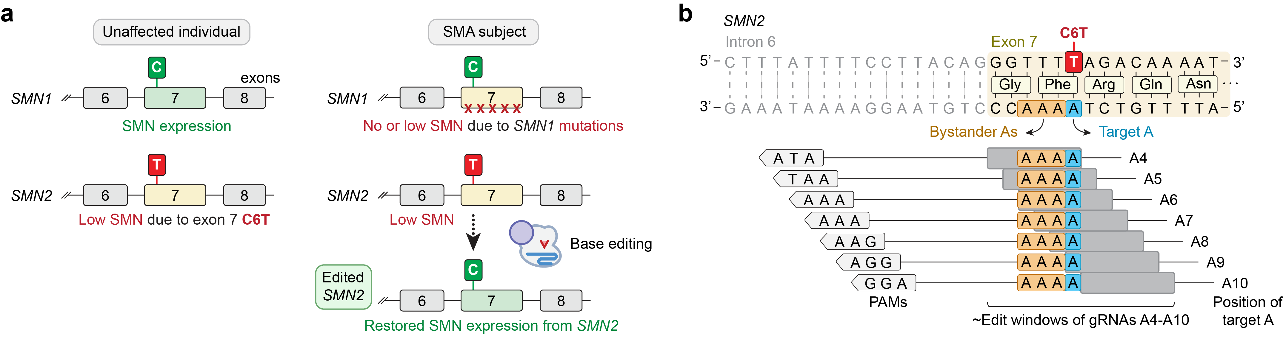 Since SMA is caused by mutations in the SMN1 gene, genome editing technologies that target the underlying genetic mutations in SMN1 could offer hope for a permanent cure for SMA. However, the heterogeneity and complexity of these mutations would require patient-specific therapeutics (which imposes challenges related to optimization and scaling thousands of editing approaches). A paralogous gene SMN2 is a main genetic modifier of SMA severity, where SMA subjects carrying multiple copies of SMN2 can partially compensate for the loss of SMN protein resulting from SMN1 loss-of-function. However, SMN2 produces only low levels of SMN protein compared to SMN1 due to a natural C-to-T substitution in exon 7 (“C6T”) that alters splicing and causes premature degradation of SMN.