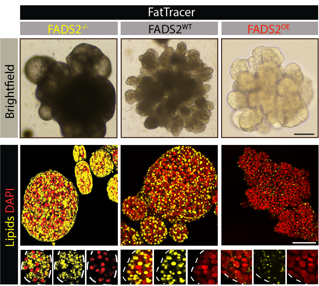 With our novel organoid models, we then proceeded to address two unmet needs in the field: 1) systematic and rapid drug screening and 2) establishing a genetic-based target screening system. Through drug screening we found out that a very specific set of drugs could effectively resolve steatosis, namely those that repress the synthesis of new fatty acids within the hepatocyte. We then turned the APOB- and MTTP-mutant organoids into a CRISPR-screening platform termed FatTracer. These mutant organoids were the perfect fit for such application for two simple reasons: they grew in culture as "natural" fatty livers and they could be further genome modified. FatTracer turned out to be a robust platform, where, in the span of a month, the effect of a specific gene knock-out on the fatty liver phenotype could be followed in real-time. Through screening 35 candidates, we discovered an important and novel role for FADS2 in steatosis biology. Loss of FADS2 aggravated steatosis, yet the opposite turned out to also work: increasing FADS2 expression could resolve steatosis, positioning FADS2 as an interesting candidate to further explore in the scope of NAFLD.
