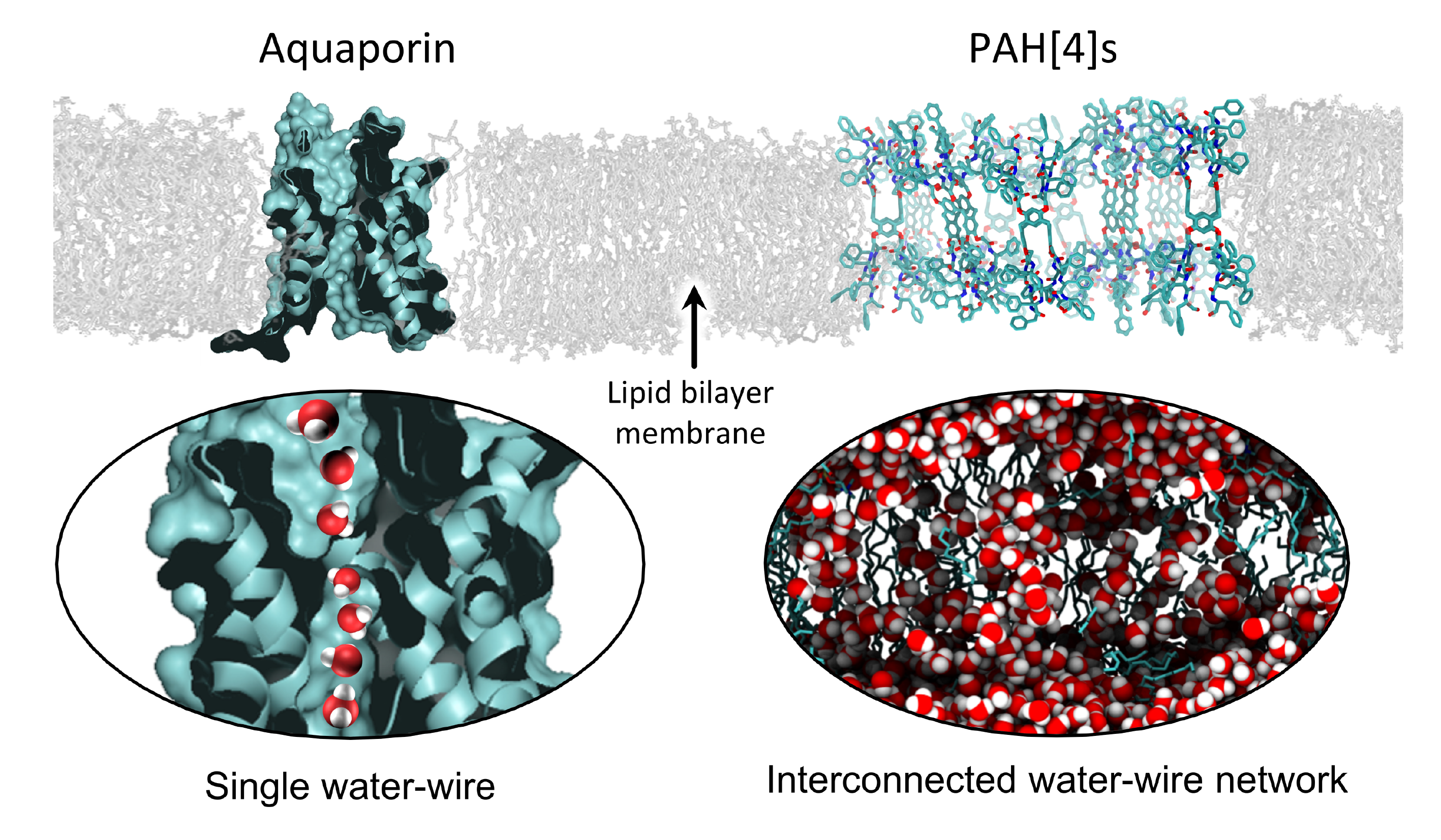 This is where the journey to the current paper [3] started. Our simple (and what turned out to be ultimately naïve) assumption was that, if a slightly smaller selective pore than that of PAP[5] could be developed into a tubular channel, it may lead to rejection of salt ions (Na+ and Cl-). Collaborator Jun-Li Hou (Fudan University), the original inventor of PAP[5} channels [4], had synthetized a variant of this channel termed peptide-appended hybrid[4] arene (PAH[4]) that had a pore width approaching ~4 Angstroms. Upon testing, our initial assumption seemed to be validated with a high qualitative rejection of ions and surprisingly high permeability comparable to that of classical aquaporin, AQP1. Our naïve assumptions, however, seemed to crumble completely when we attempted to explain the molecular mechanism of transport by molecular dynamics (MD) simulations. We found that water did not like to enter the central pore of these channels! Further in individual channels, sometime the water escaped from the open side “windows” of the channel and made its way between the lipid molecules and the channel wall, but at a low rate and not as a continuous water wire.