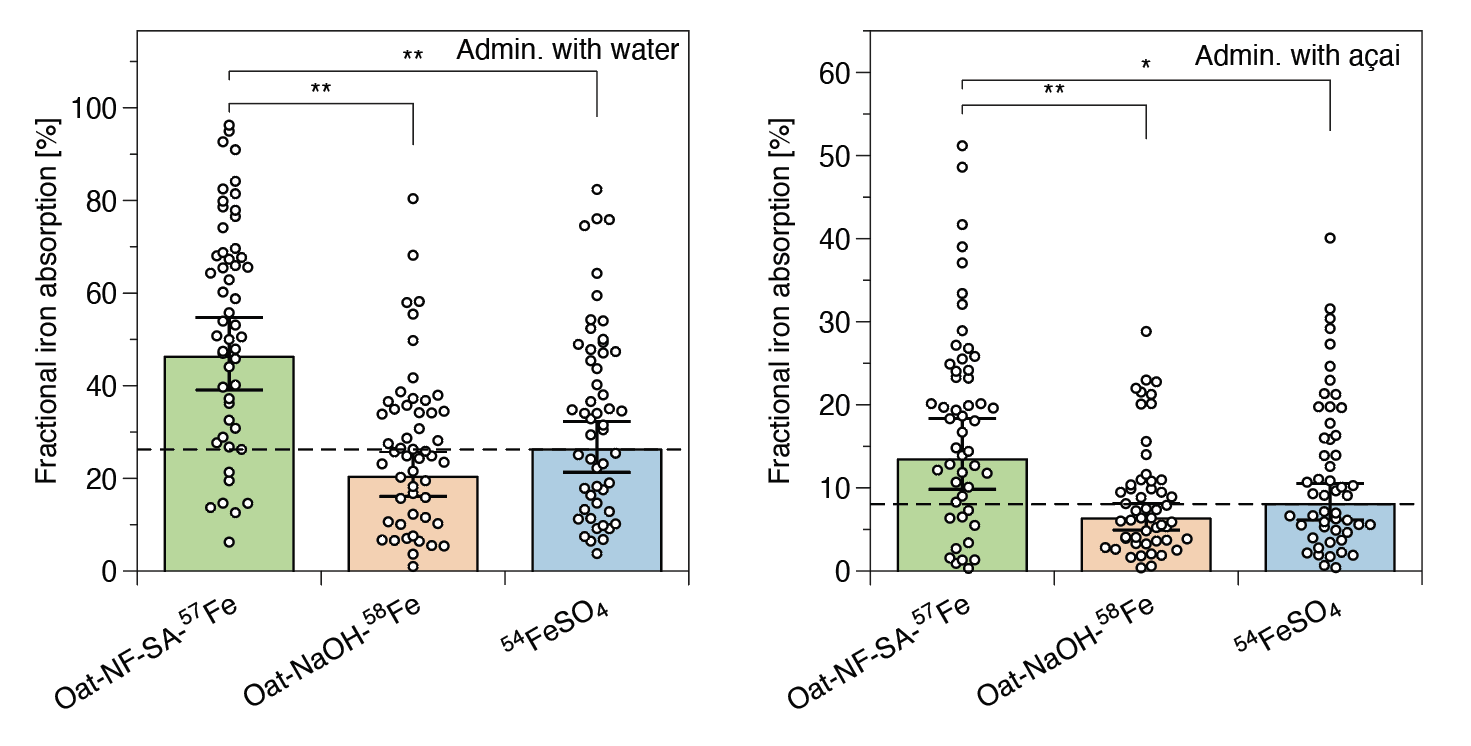 The clinical trial provides compelling evidence to validate the high bioavailability of our compound, as shown in Figure 1. Conducted with a randomized, crossover design, the study allowed each of the 52 participants to serve as her own control. When taken with water, ferrous sulfate showed absorption of about 26%, while the OatNF-SA-Fe hybrid achieved 46%, a 76% improvement. A second formulation, OatNF-NaOH-Fe, containing mostly ferric iron, still achieved around 20% absorption, demonstrating the underlying effectiveness of the nanofibril platform even when the iron state differs. When administered with a polyphenol-rich açai puree, known to reduce iron absorption, the OatNF-SA-Fe compound maintained a strong advantage, with absorption approximately 65% higher than that of ferrous sulfate. In short, the clinical data confirm that oat-based nanofibrils provide highly bioavailable iron across a range of dietary contexts.
