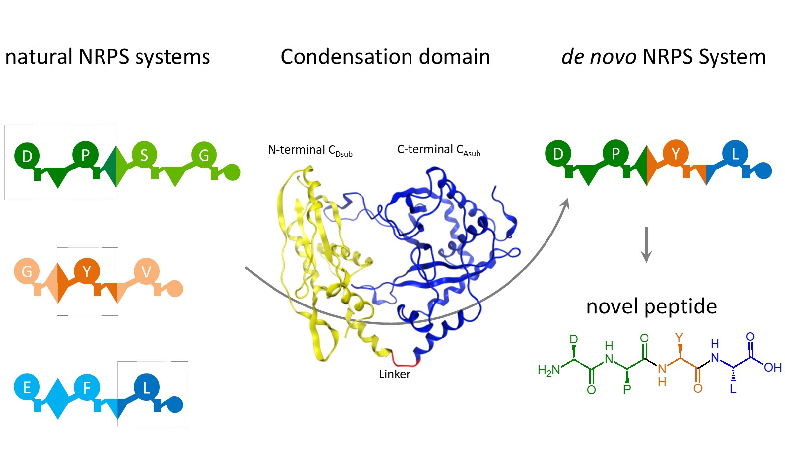 Recently, we offered a first solution to this challenge. We were able to delineate guidelines - denoted as the concept of eXchange Units (XUs) - to engineer modular NRPSs to biosynthesise new-to-nature peptidic natural products with unprecedented efficiency. Analogous to playing with LEGO®, by combining building blocks from 15 NRPSs we reconstituted naturally available peptides, peptide derivatives, and generated new-to-nature peptides de novo. Whereas the restrictions introduced by the concept of XUs are an integral feature of its success and reliability, these restrictions call for a very large number of available building blocks to design novel biosynthetic pathways in considerable numbers. We were therefore keen to come up with a more disruptive strategy to overcome the bottleneck.