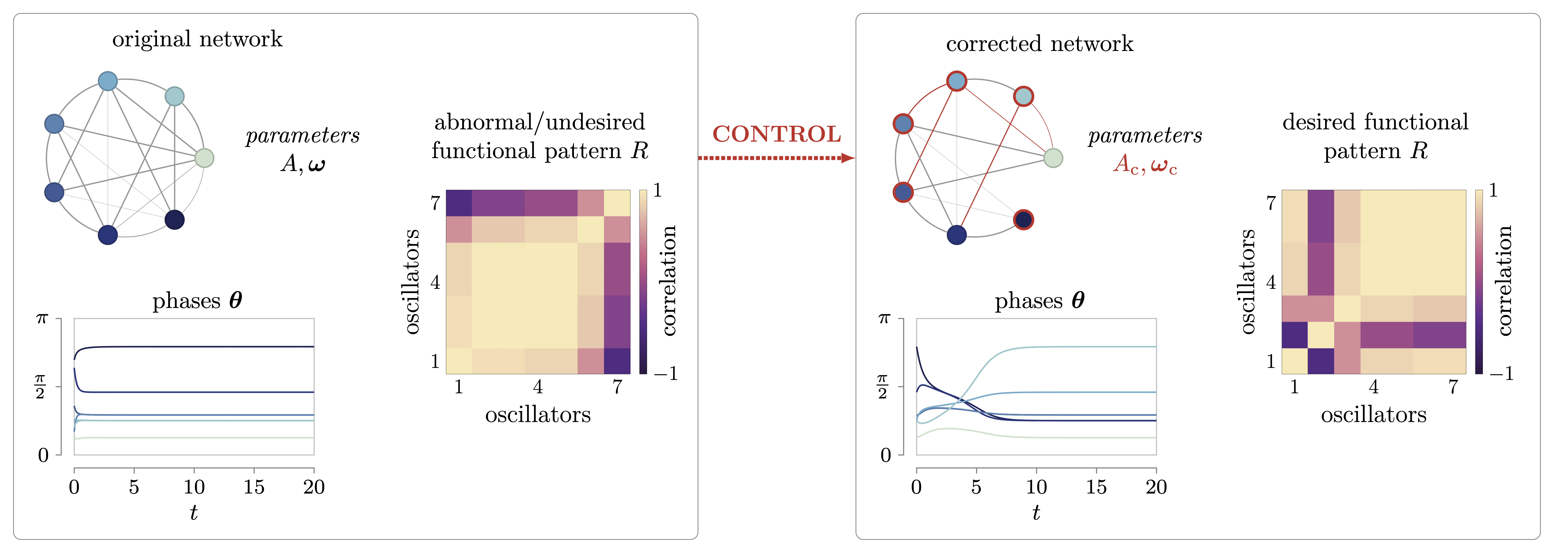 Network control to enforce a desired functional pattern from an abnormal or undesired one. In this example, we computed the closest set of coupling strengths and natural frequencies to the original ones that enforce the emergence of the target pattern. Importantly, only a subset of the original parameters has been modified.