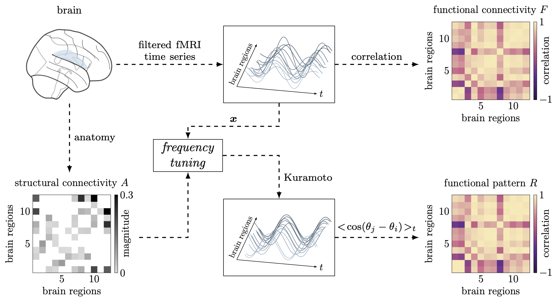 Replication of empirically recorded functional connectivity in the brain through tuning of the natural frequencies of Kuramoto oscillators. The anatomical brain organization provides the network backbone over which the oscillators evolve. The recorded brain activity time series provide the relative phase differences between co-fluctuating brain regions, and thus define the desired phase differences, which are used to calculate the metabolic change encoded in the oscillators' natural frequencies.