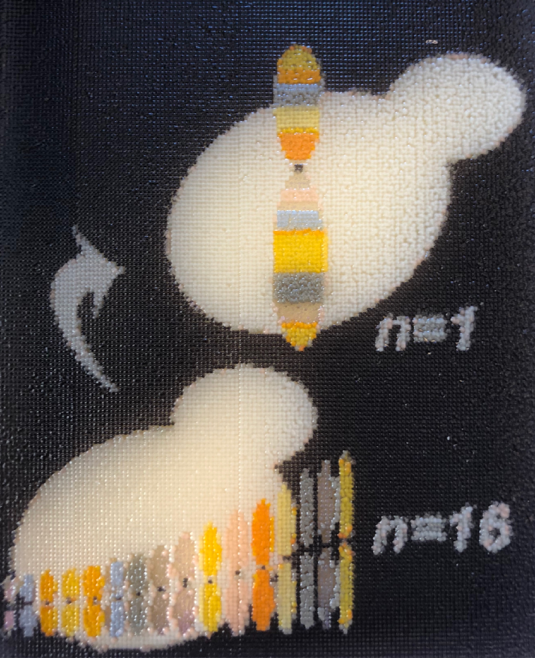 Figure 1 A yeast art print showing our fusion chromosome strategy to fuse n=16 into n=1. Each “biopixel” (there are ~25,000) is a live yeast encoding different colour pigments. Yeast art was designed and printed by Jasmine Temple of NYU Langone Health.