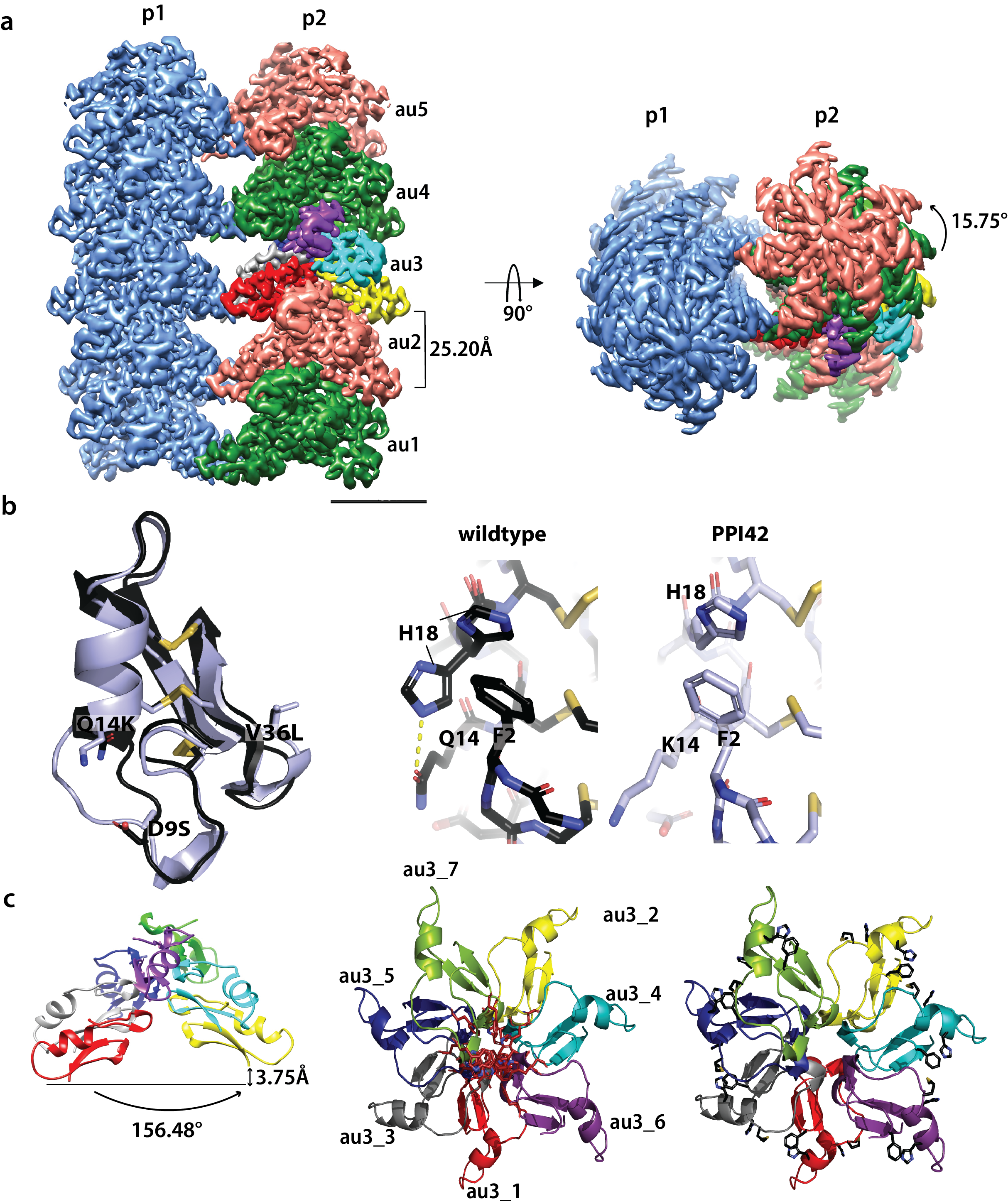 Figure 2: a: High-resolution cryo-EM structure of the protein fibril formed by PPI42. Isosurface representation of the cryo-EM map is shown along the transverse axis and along the longitudinal axis of the fibril (90º rotation). The structure is composed of two coiling protofilaments (p1 and p2). The asymmetric units (au) are related by helical symmetry (axial rise of 25.20 Å and azimuthal angle of 15.75°shown for the p2 protofilament) and coloured differently (green and salmon). Each asymmetric unit is composed of seven monomers. The scale bar is equivalent to 30 Å. b: left: Comparison of the plectasin wildtype crystal structure (black) and PPI42 fibril structure (light blue). The three mutated amino acids are highlighted as sticks. right: Differences in the coordination of H18 between the wildtype and PPI42. The wildtype showed two distinct orientations of H18 while PPI42 only showed one orientation due to Q14K mutation. c: left: Atomic model of one asymmetric unit (au_3) viewed from the side. Each pair of monomers within an asymmetric unit are related to each other by a pseudo helical symmetry (average axial rise of 3.75 ± 0.15 Å and an average twist of 156.48 ± 2.25°).middle: Hydrophobic (red amino acids shown as sticks) interactions in the fibril centre shown in one asymmetric unit with view from the top. Numbering corresponds to the relative monomer position in the asymmetric unit. right: Hydrophobic interactions (black amino acids shown as sticks) forming the outer hydrophobic ring of one protofilament shown in one asymmetric unit with view from the top.