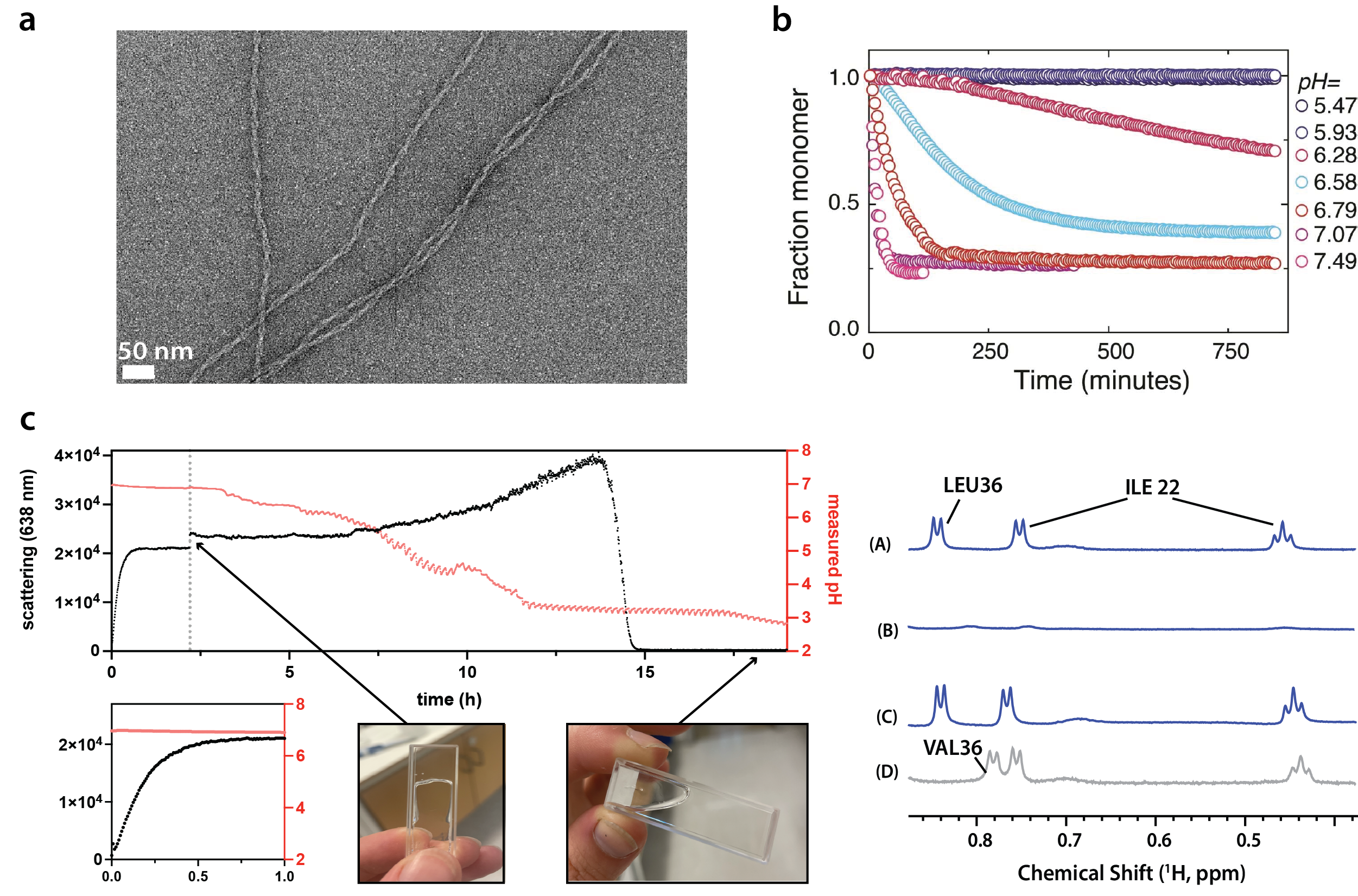 Figure 1: a: Images of the fibrils using negative stain EM. PPI42 formed protein fibrils consisting of two coiling protofilaments. b: Fibril formation kinetics for PPI42 fibrils. The fraction of monomer was determined by integration of 1H signals for the I22 and L36 methyl groups relative to time 0. c: left: Light scattering and monitored pH of PPI42 diluted into phosphate buffer pH 7 and subsequently titrated with 1M HCl. The grey line marks the starting point of the titration. Insert shows a zoom in between 0 and 1 hour to visualise the increase in light scattering after dilution into pH 7, while the pH stays constant. Pictures show the sample at equilibrium after dilution into pH 7 (formed a gel) and after the titration with HCl (liquid). right: Monomeric state of PPI42 before dilution (A), at equilibrium at pH 7 (B) and after titration (C) was assessed with NMR proving that the fibril formation was reversible (signal recovery). (D) shows the wiltype plectasin signal.