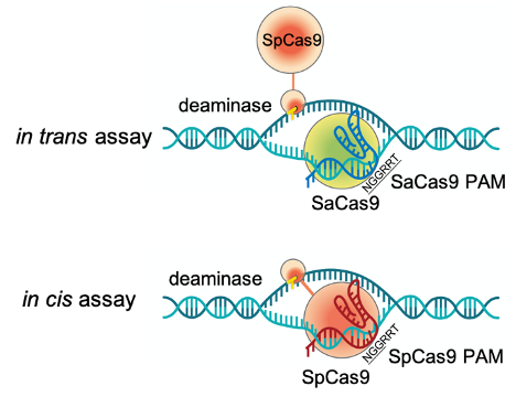 As whole genome sequencing is laborious and costly, we developed a high-throughput proxy, in cis-in trans assay, to evaluate the on-target activity and the spurious deamination activity of base editors. In our “in trans” assay, we use an orthogonal Cas9 from S. aureus to create a stable R-loop and expose the target region as ssDNA, which is supposed to be the substrate of spurious deamination. On-target activity is reported in the in cis assay, in which the SpCas9-based CBE is used as normal – the SpCas9 that is part of the base editor complex directs the editor to its target site. This assay was proven to be valid when it showed consistent results with our whole genome sequencing experiments.
