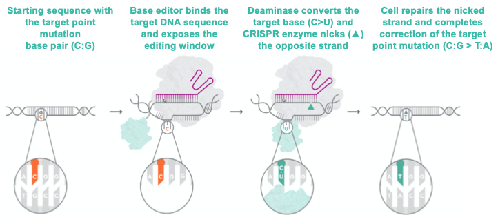 While CRISPR-Cas9 nucleases use a “cut-and-paste” method to rewrite genetic information, base editors work like an “eraser-and-pencil” to correct point mutations in the genome. Double stranded DNA (dsDNA) breaks, or “cuts”, in the genome can lead to insertions, deletions, translocations, and other large-scale chromosomal rearrangements1. Base editors are molecular machines with the ability to precisely edit a single base without causing dsDNA break. Cytosine DNA base editors (CBEs), which can deaminate target cytosine residues to form uracil, effectively causing “C-to-T” edits, were first published in 20162. The original, and most widely used, CBEs contain a cytidine deaminase called “rAPOBEC1”, a catalytically impaired Cas9 and one or two units of uracil DNA glycosylase inhibitor (UGI)2, 3.