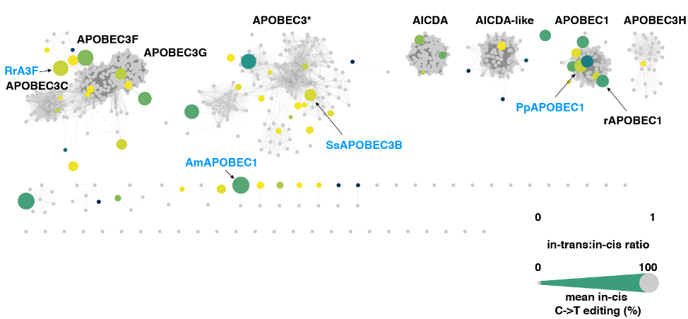 To avoid limiting ourselves to cytosine deaminases that are already known to work in the context of CBEs, we interrogated the extensive diversity of cytidine deaminases that nature has to offer. 153 sequence-diverse cytidine deaminase enzymes were chosen from a similarity network generated based on known APOBEC1 sequences. These 153 enzymes were cloned into a base editor context (“BE4”)3 and assayed using our high-throughput, in cis/in trans assay, which evaluates CBE on-target (in cis assay) and CBE guide-independent (in trans assay) outcomes. Interestingly, we find that not all cytidine deaminases work well or at all in the context of cytosine base editors. Of the 153 cytidine deaminases that we studied; four deaminases displayed significantly decreased guide-independent deamination activities whilst maintaining robust on-target activity relative to BE4.