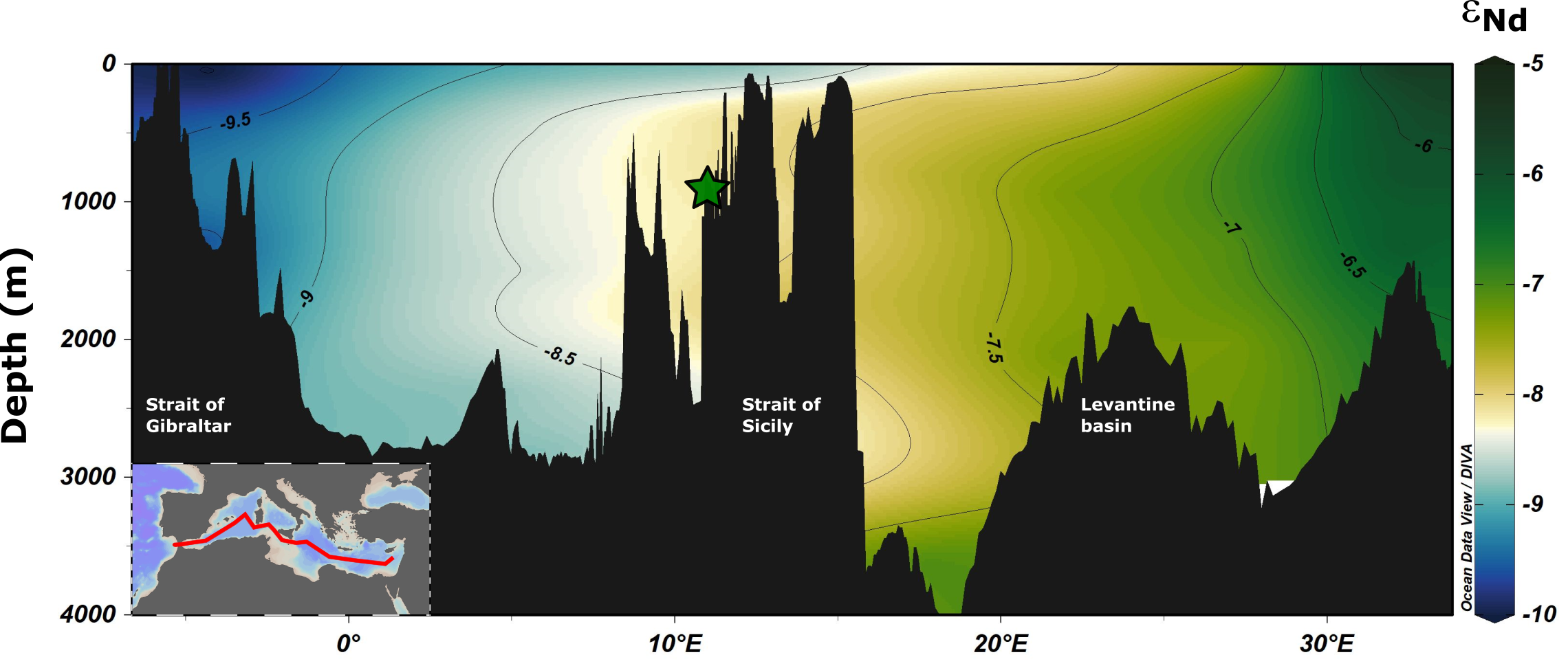 To investigate changes in the water-outflow from the Eastern Mediterranean Sea we used neodymium isotope ratios. This proxy allows to discriminate well between the eastern and the western originated waters masses, since εNd seawater values from the E-Med are typically higher than W-Med εNd 8-12 (Fig. 2).