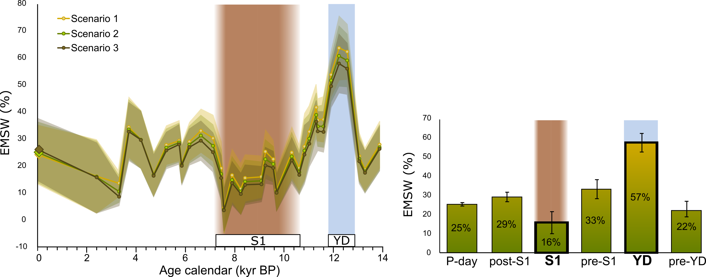 Our results show enhanced EMSW outflow during the Younger Dryas, more than twice than the present-day. Arguably, this is the result to the combined effect of enhanced convection in the Aegean and Levantine basins in response to a regional aridification phase and weaker western Mediterranean deep water formation that led to a deeper expansion of the EMSW into the western basin. During the S1 a substantial reduction of the EMSW outflow through the Strait of Sicily occurred, being four times lower than during the YD and half than at present-day (Fig. 3).