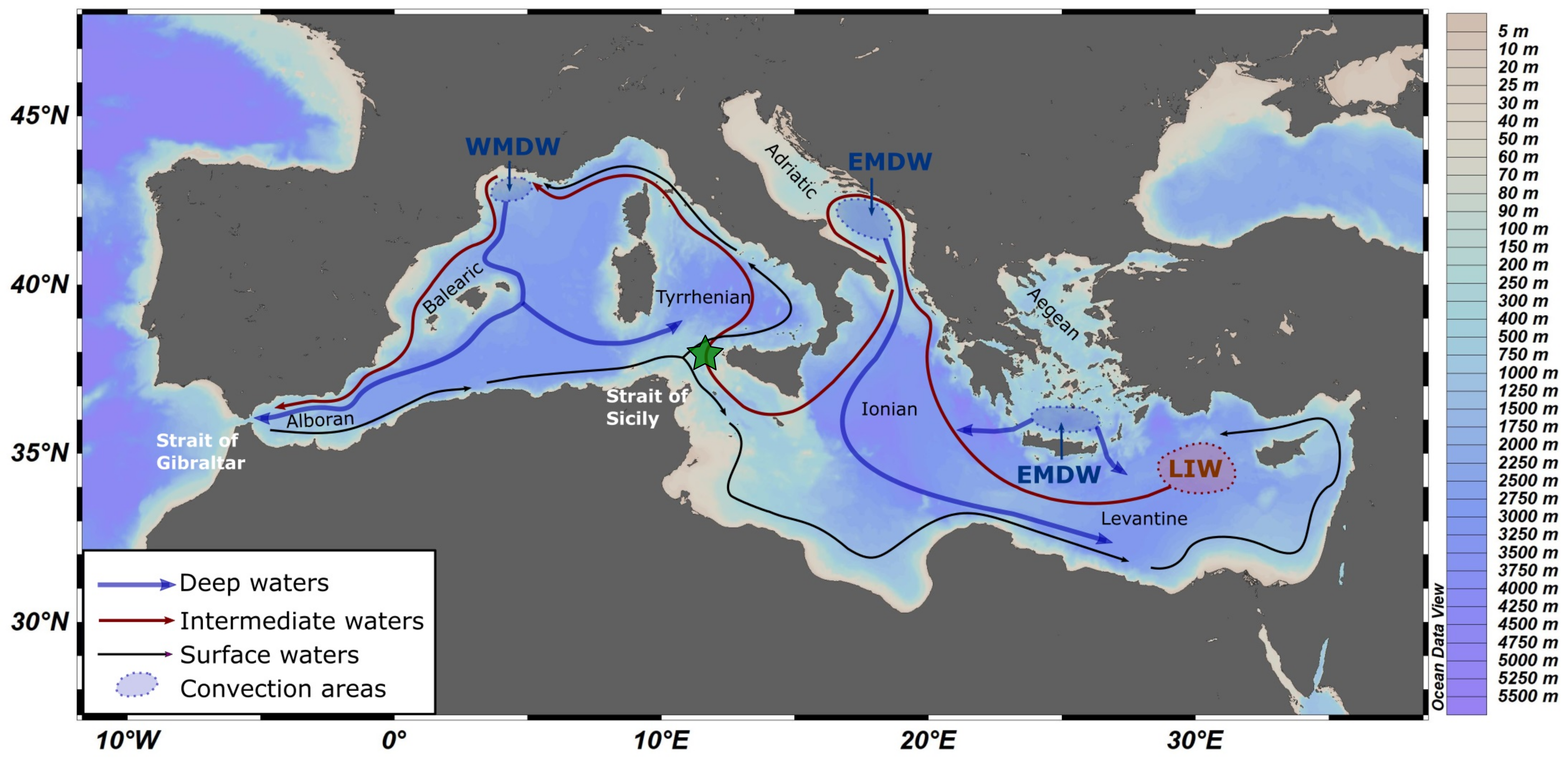 The Mediterranean Sea and the Atlantic Ocean behave as a coupled system where Atlantic surface waters enter through the Strait of Gibraltar and progressively transform into saltier surface waters, that eventually sink to intermediate depths at the Levantine Sea as Levantine Intermediate Water (LIW). The LIW contributes to the formation of deep waters in the Adriatic Sea and the Aegean Sea, the so-called Eastern Mediterranean Deep Water (EMDW). Both EMDW and LIW outflow through the Strait of Sicily, hereafter called Eastern Mediterranean Source Waters (EMSW), contributing also to the convection of deep waters at the Gulf of Lions to produce Western Mediterranean Deep Water (WMDW). Both WMDW and EMSW eventually outflow into the Atlantic Ocean through the Strait of Gibraltar forming the so-called Mediterranean Outflow Water (MOW) and thus, closing the Mediterranean circulation system 1–3 (Fig. 1).